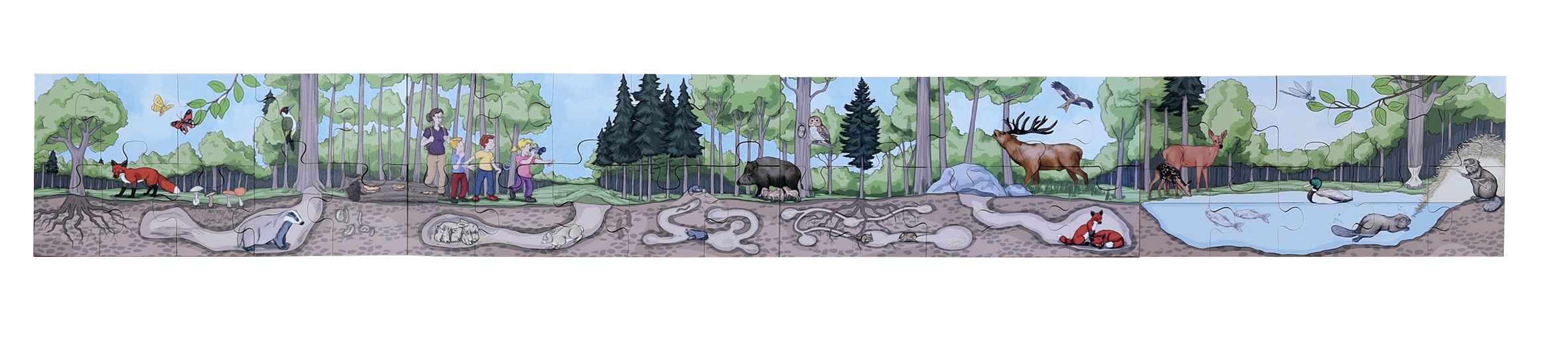 Eine spannende Waldszenerie, die dazu einlädt, sie näher zu erforschen! Schaut genau hin, welche Tiere es über und unter der Erde zu bestaunen gibt!