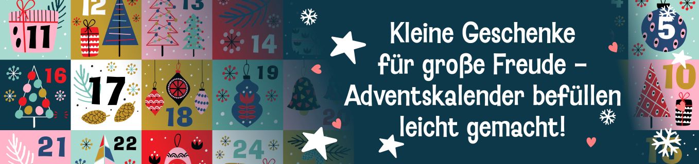 Entdecke unsere vielfältigen Adventskalender Füllideen und kleinen Geschenkartikel zum Befüllen, Verschenken und Freude machen! Ob für den selbstgemachten Adventskalender, als Mitbringsel beim Kindergeburtstag, Gewinne für die Tombola oder Überraschungen für Sommerfeste – hier findest du jede Menge originelle Mini-Geschenke von 0,50 € bis 10 €.
