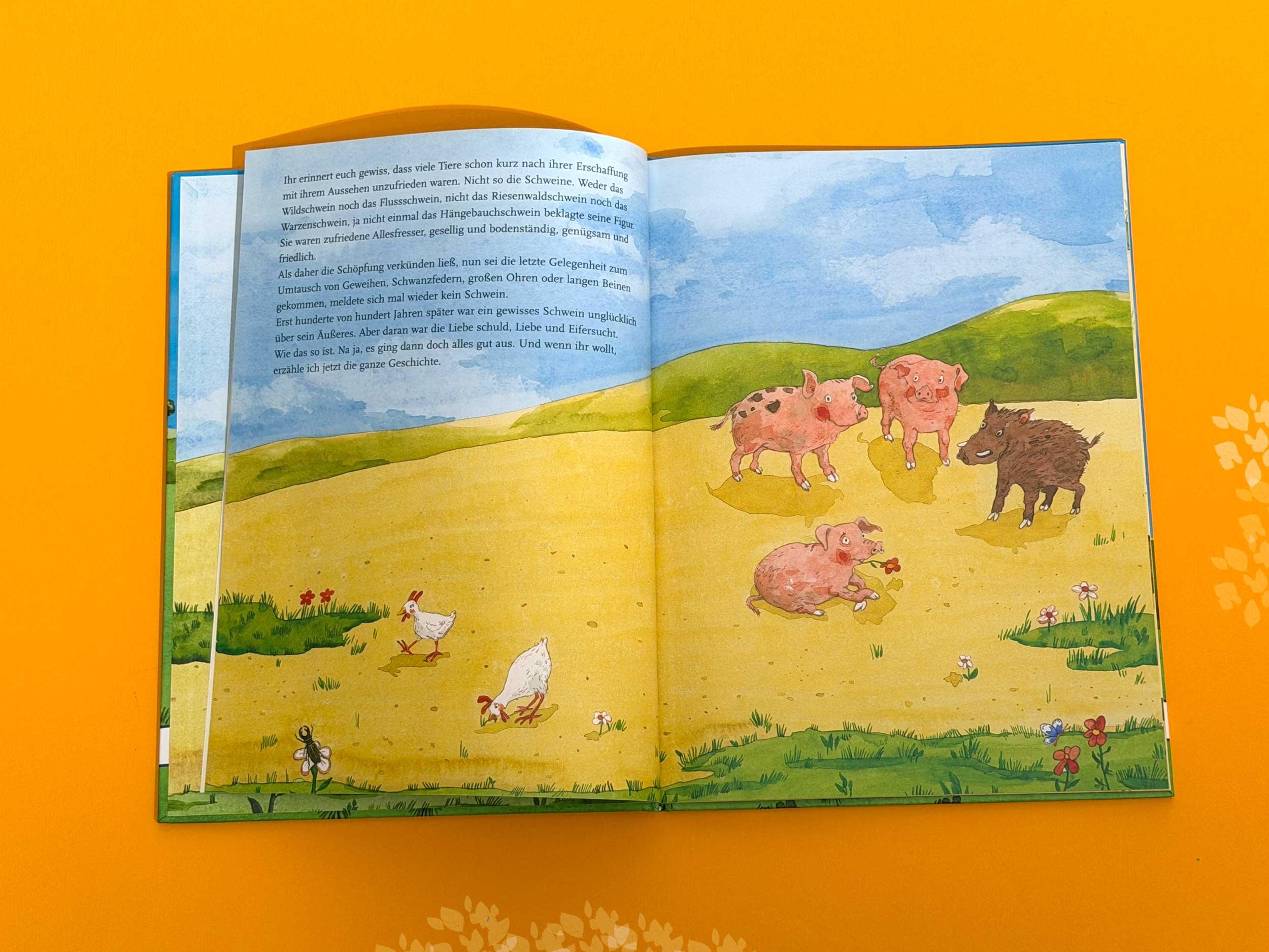 Das kleine Schwein hat es wirklich schwer. Das nette Bauernmädchen Katinka hat nur Augen für das hübsche Schaf und beachtet das kleine Schwein überhaupt nicht. Deshalb ist es sehr traurig. Wie ungerecht die Welt doch ist! Vor Enttäuschung wälzt es sich lautstark jammernd in einer Pfütze, so lange bis Katinka ihm erschrocken zur Hilfe eilt. Und Katinka erkennt zu ihrer Überrschung, dass das kleine Schwein ein liebenswürdiges Kerlchen ist, mit dem man sich durchaus zeigen kann.
