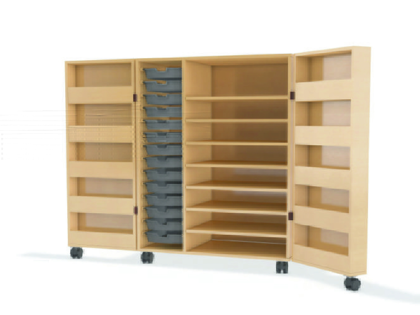 rechts 6 Einlegeböden, 1 fester Boden und links 14 Schienen für Kunststoffschübe CS 1 oder CS 2 (Kunststoffschübe separat bestellen!)