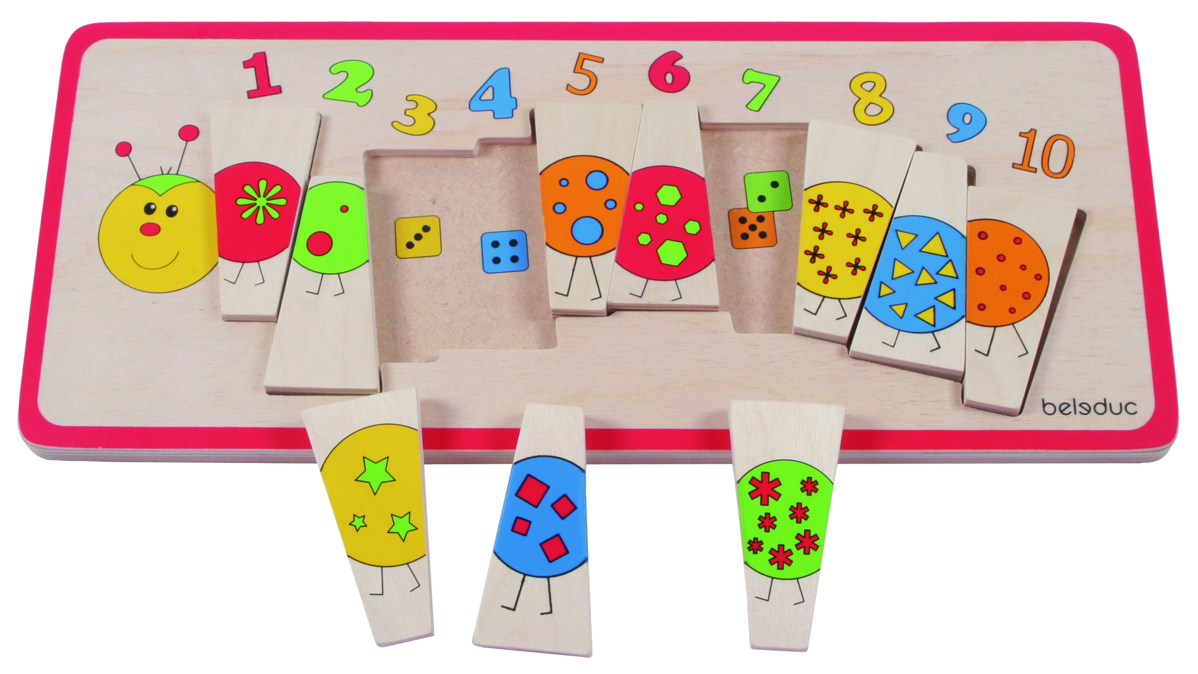 Mit dieser farbenfrohen Raupe macht Zählen lernen wirklich Spaß. Anhand von Farben, Formen und unterschiedlichen Mengen auf den Körpergliedern werden Kinder spielerisch mit dem Zahlenraum 1 bis 10 und den ersten Schritten der Mengenlehre vertraut gemacht. Die aufgedruckten Würfelaugen unter den herausnehmbaren Gliedern ermöglichen ein genaues Zuordnen der Puzzleteile und regen erste Rechenversuche an.
