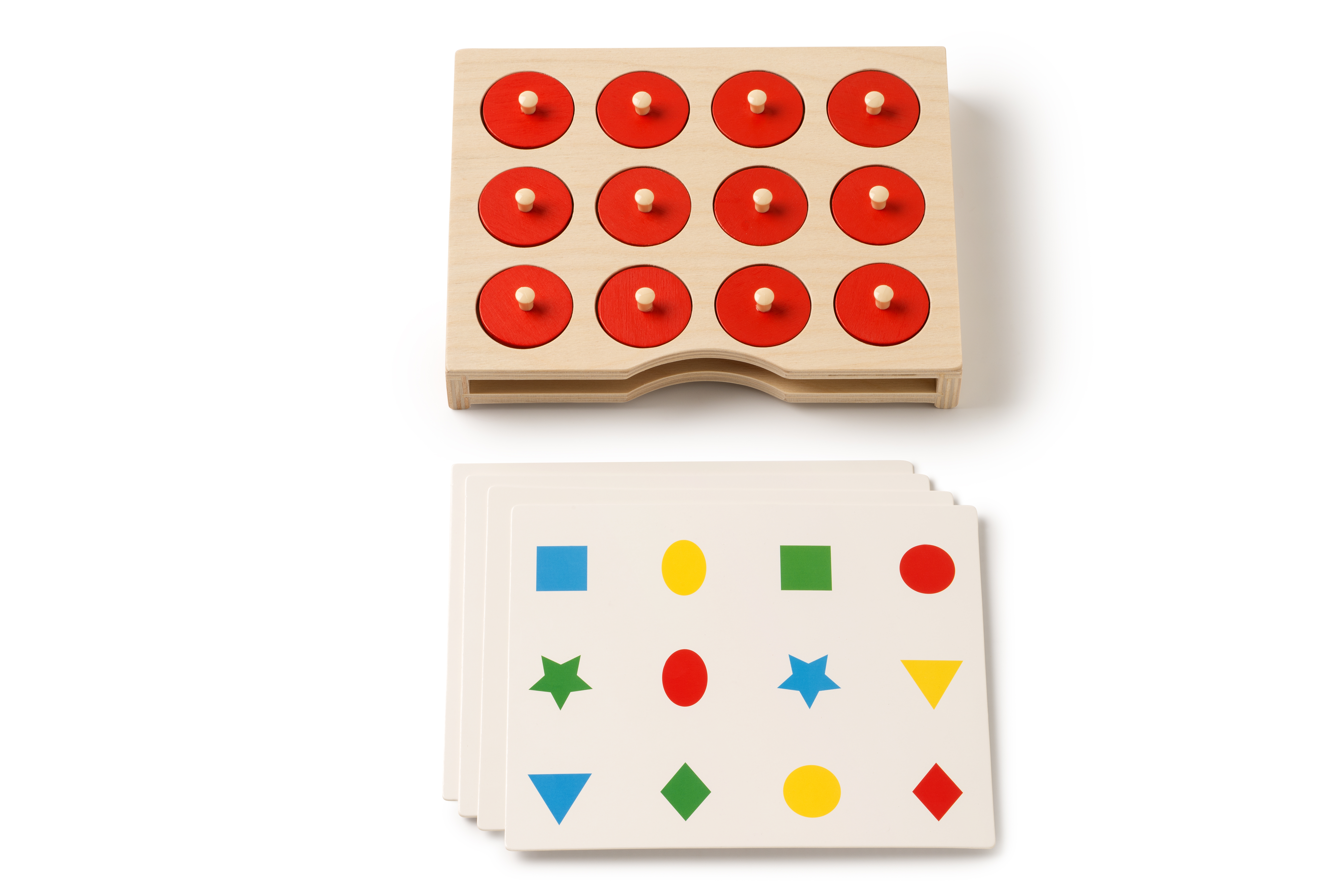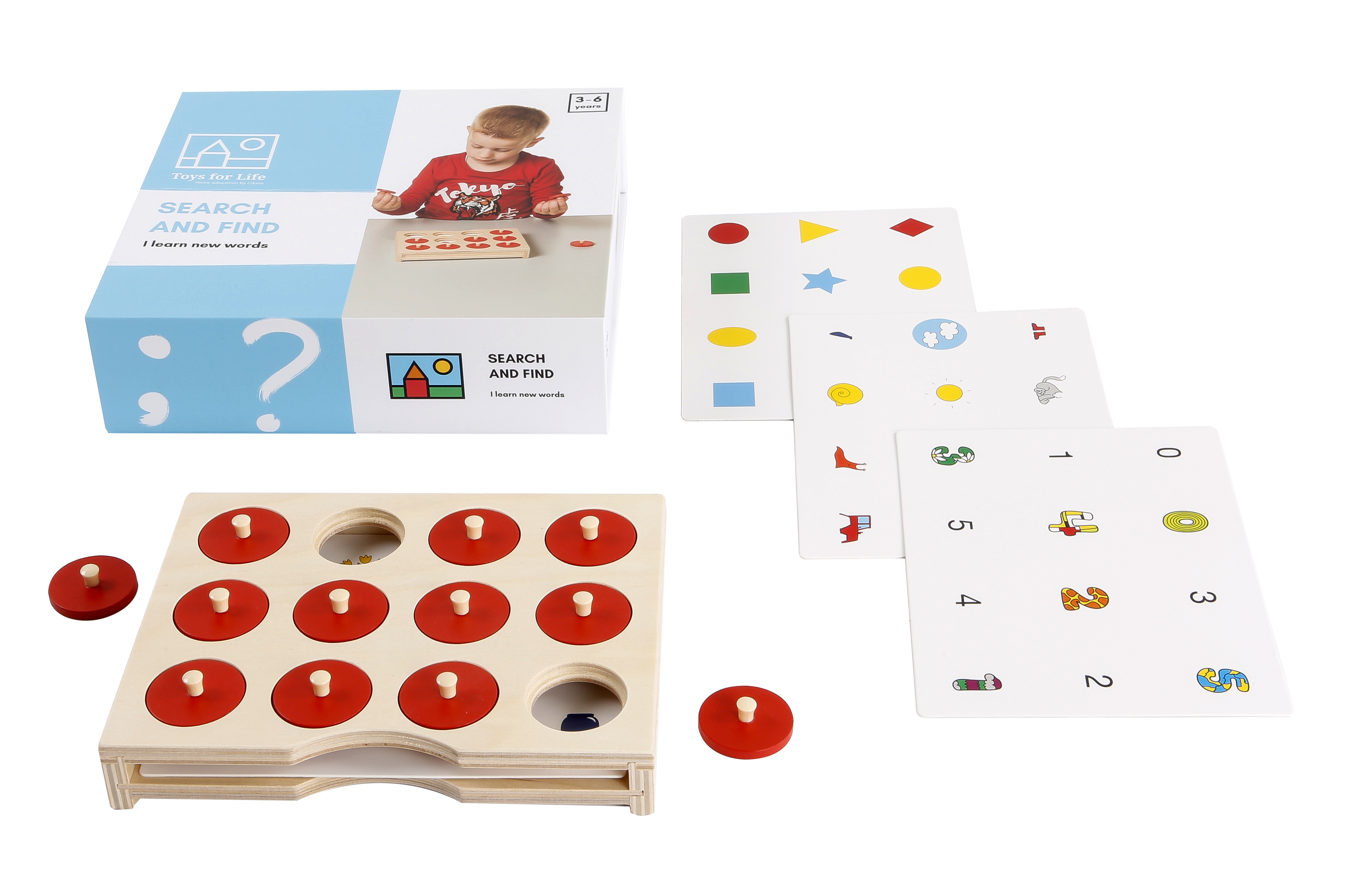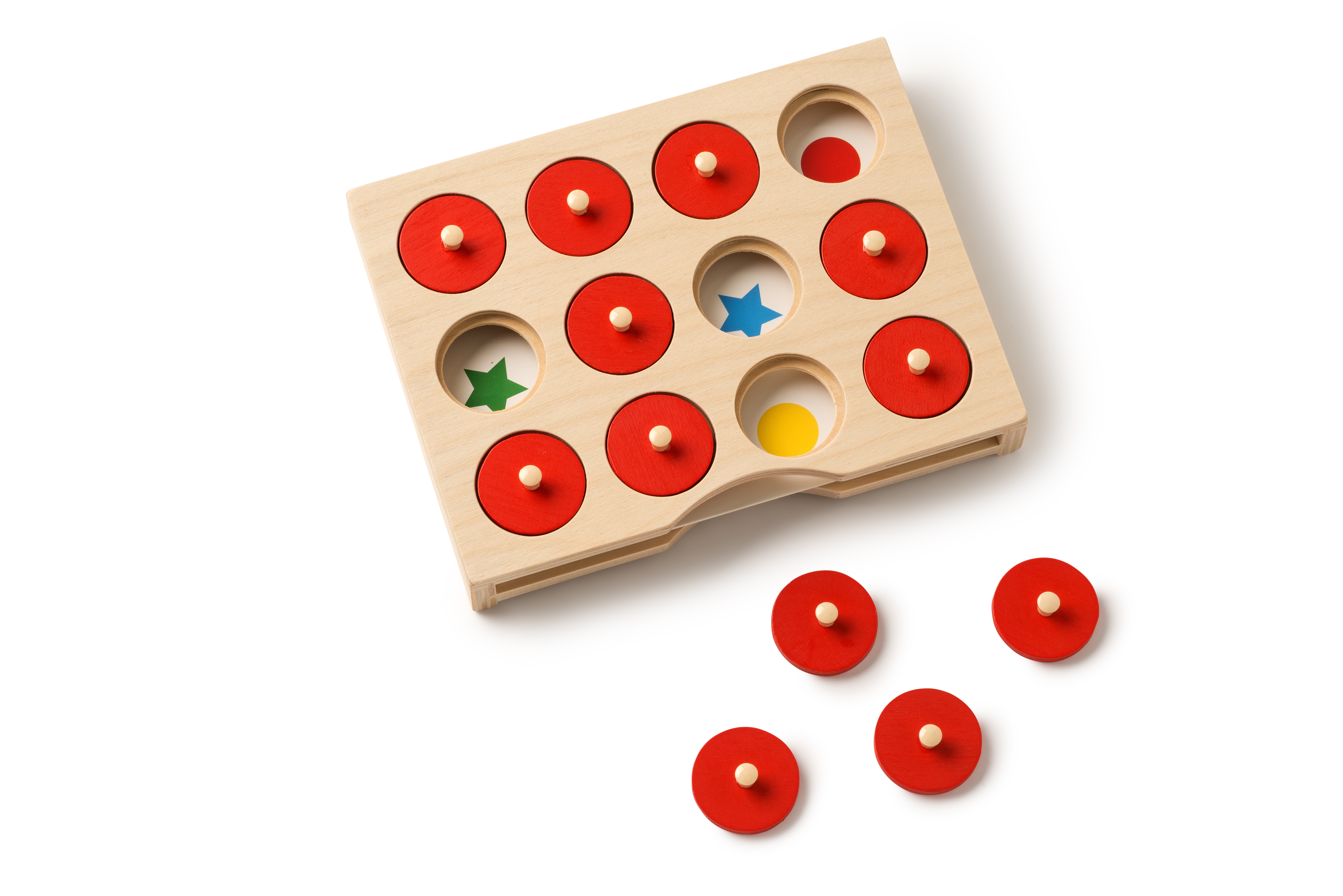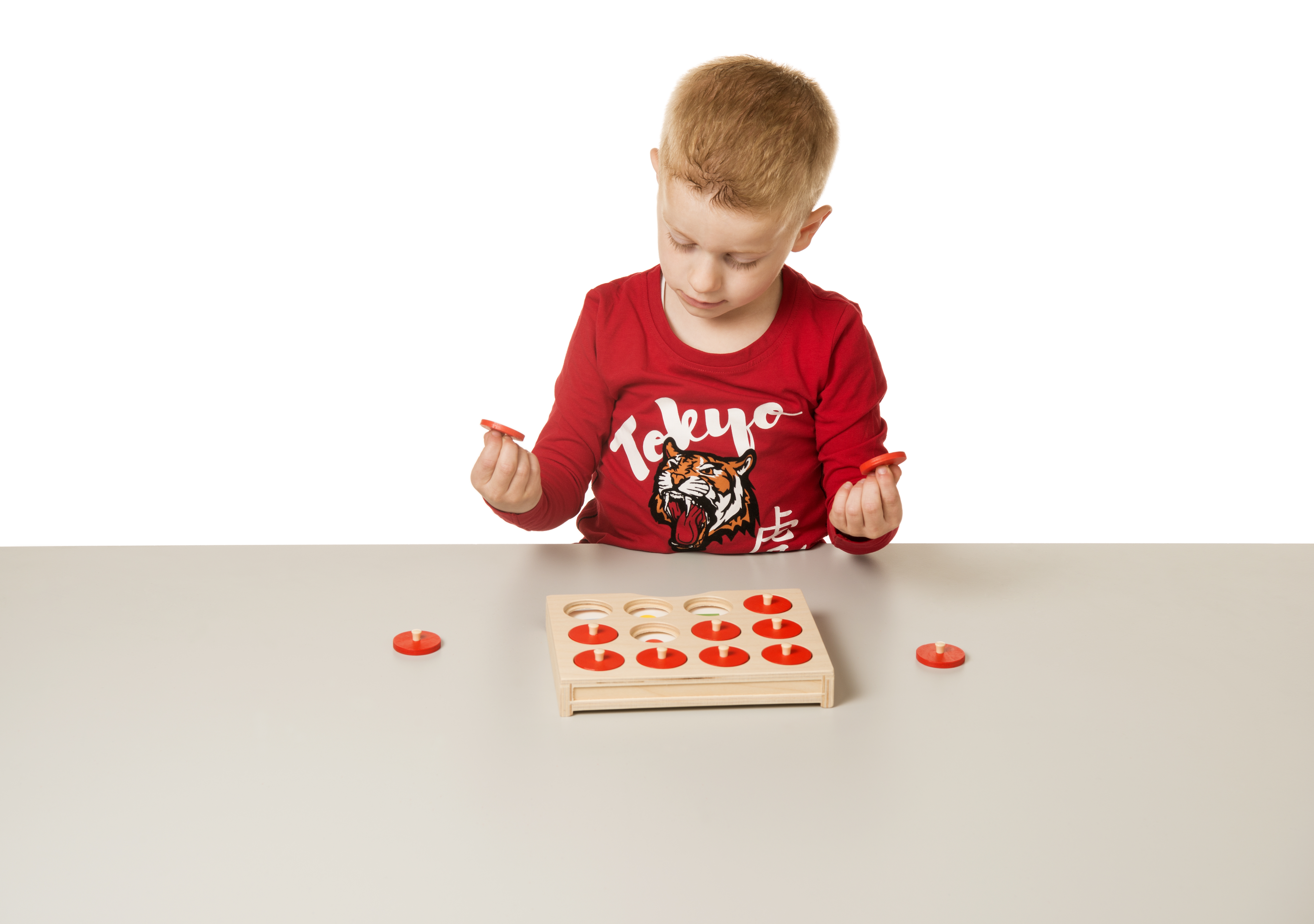 Eine Aufgabenkarte ins Holzspielbrett stecken. Ein Deckelchen hochheben und beschreiben, was zu sehen ist: Wer findet das dazugehörige Bild unter einem anderen Deckel? Fördert Auge-Hand-Koordination, räumliches Vorstellungsvermögen und visuelle Diskrimination.