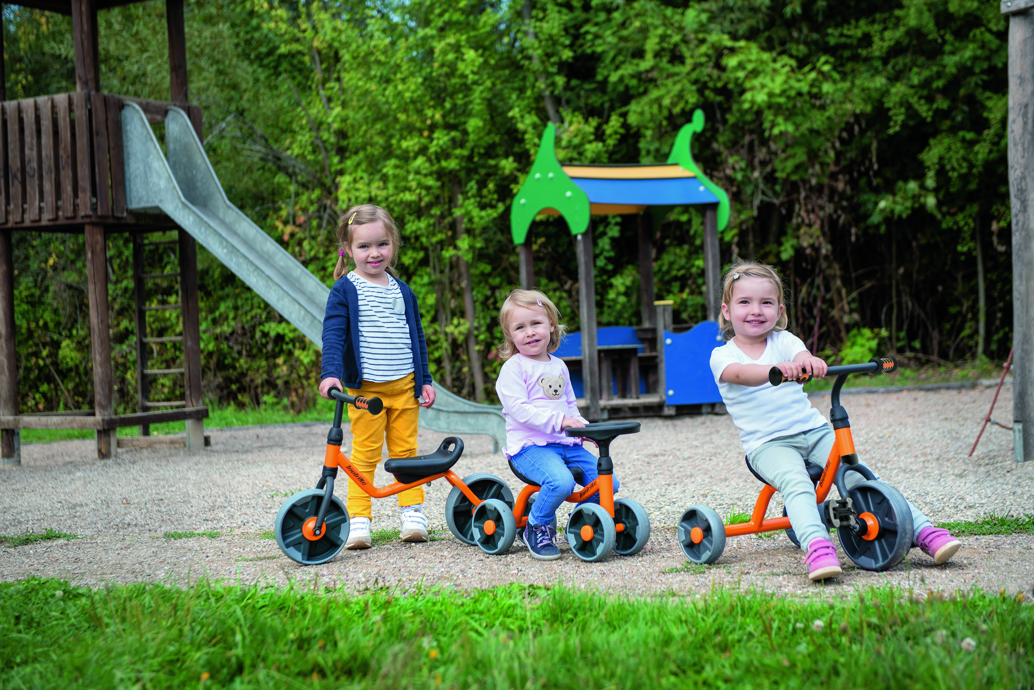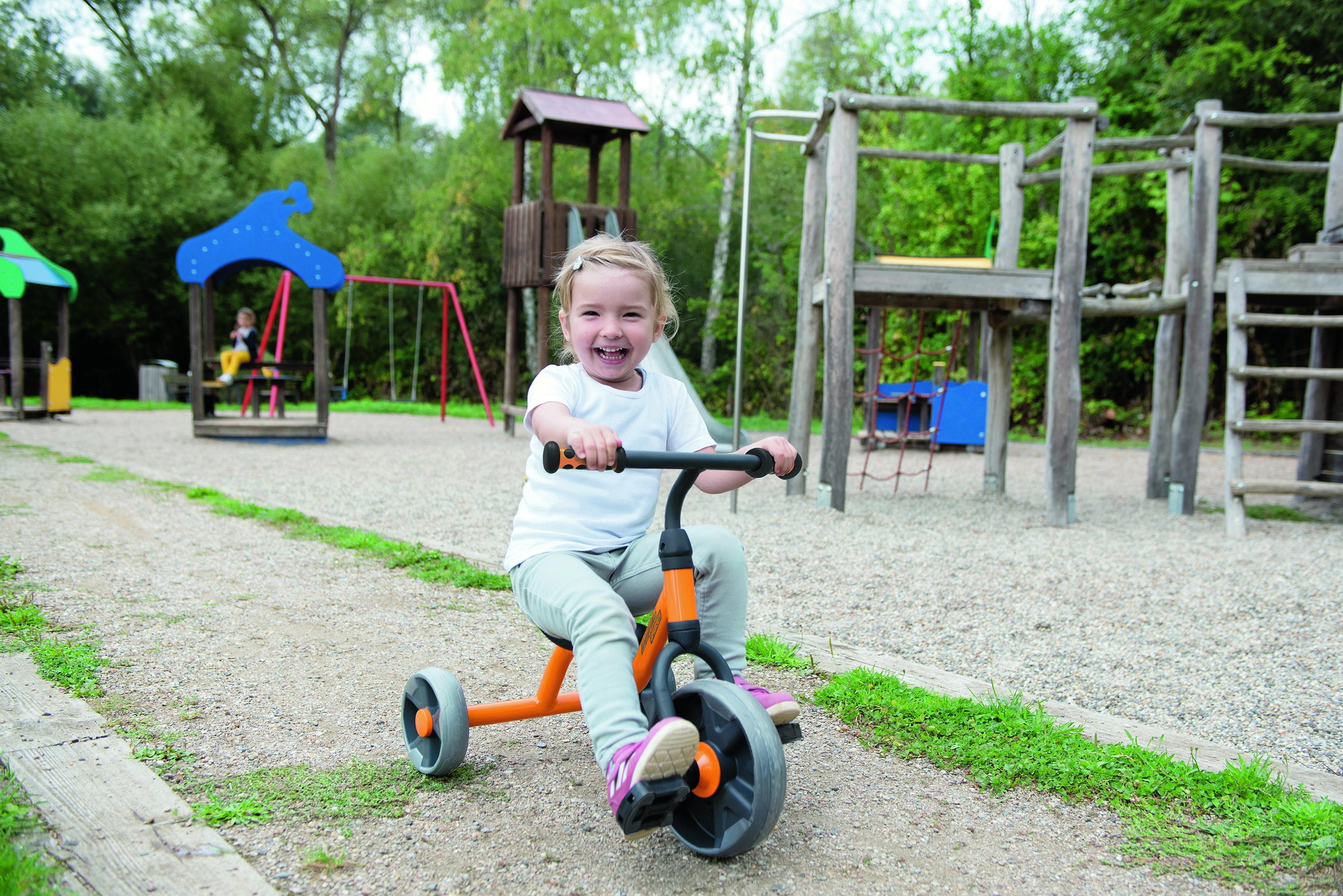 Mit dem kleinen Dreirad kann direkt losgefahren werden. Hier üben die Kleinsten die Koordination beim Treten und gleichzeitigem Lenken. Der integrierte Griff im Sitz ermöglicht ein einfaches Handling.