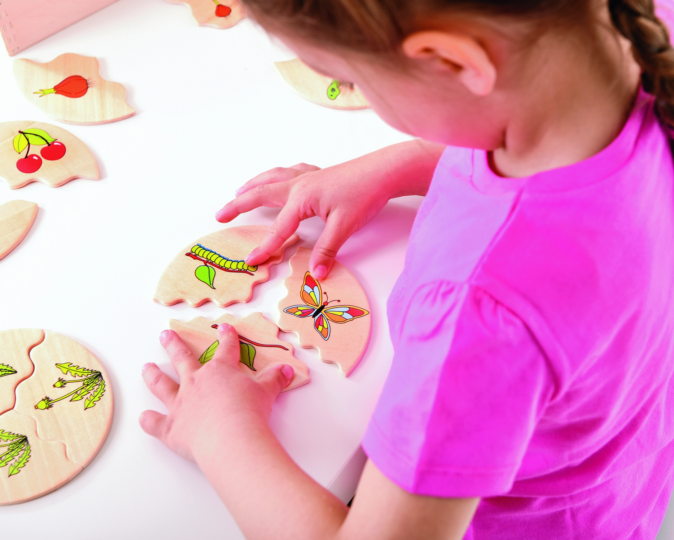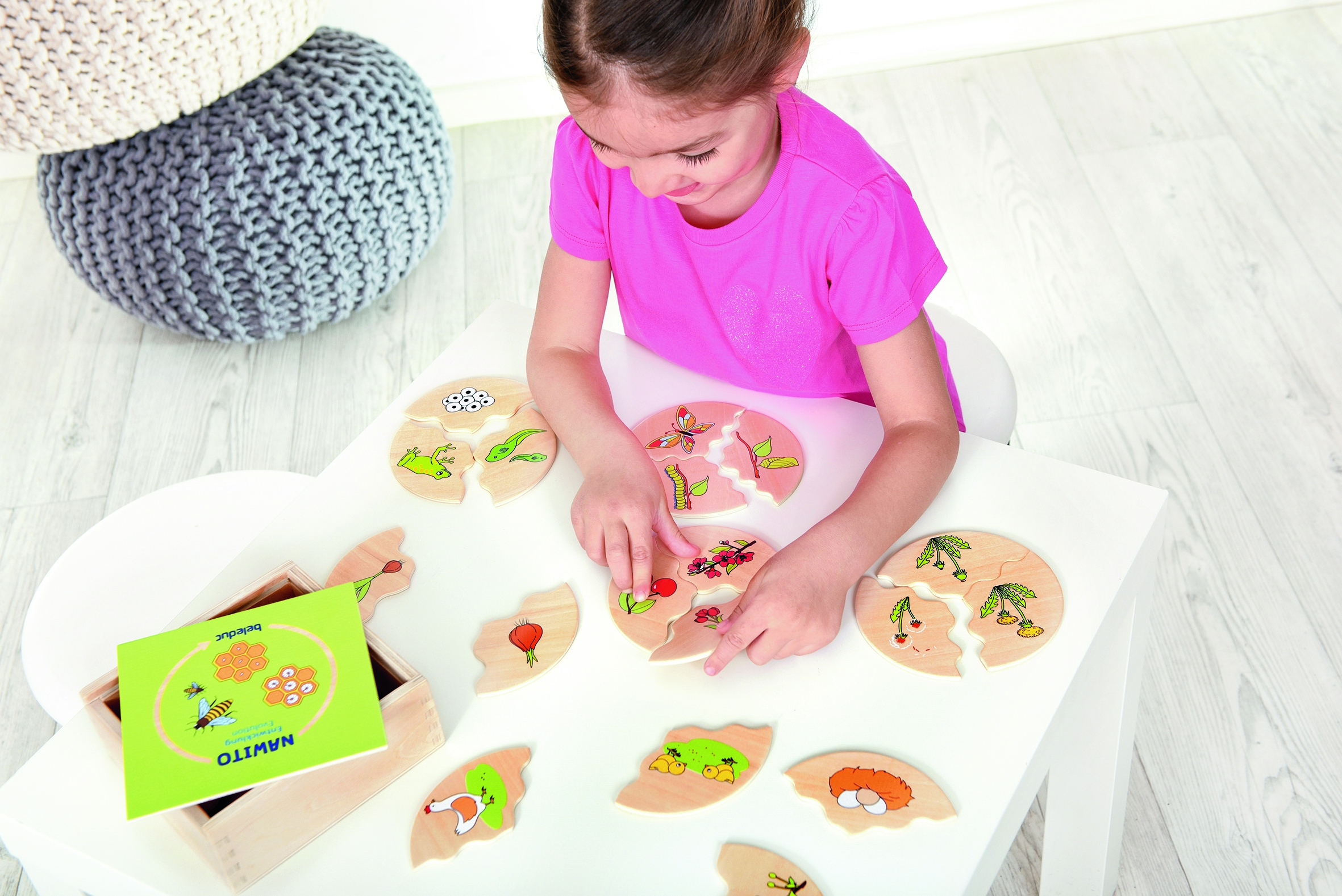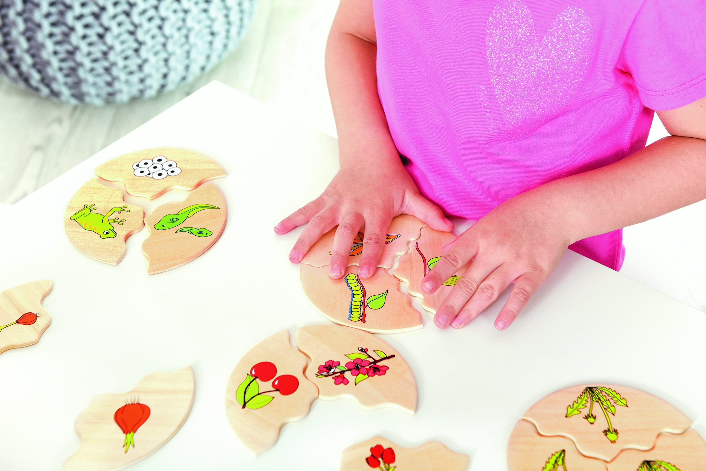 Natürliche Entwicklungsprozesse sind ein spannendes Thema für neugierige Kinder. Von der Blüte zur Frucht, vom Ei zum Huhn, aber wie war das mit dem Frosch? Das 3-teilige Puzzle fördert die Kombinationsfähigkeit und das Verständnis von Vorgängen in der belebten Natur.