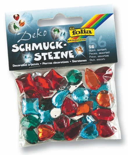 Schmucksteine in verschiedenen Formen und Farben aus Acryl mit Löchern zum Annähen oder Aufkleben.