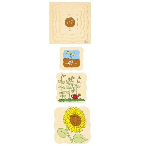 Vom Sonnenblumenkern zur Sonnenblume werden die Entwicklungsphasen in 4 Ebenen wiedergegeben.