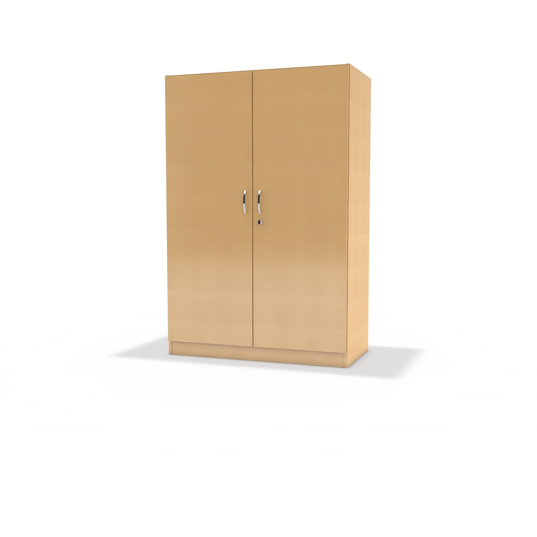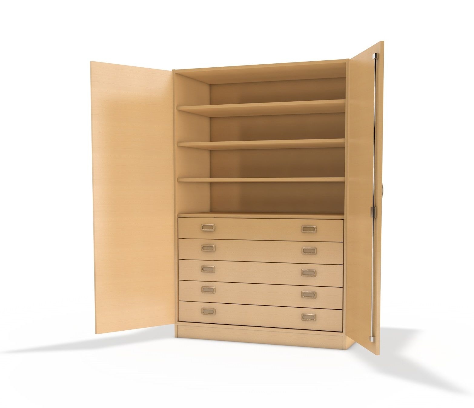 Doppeltür, abschließbar, unten 5 breite Schubkästen (Griffmuscheln), oben 3 Einlegeböden, Segmentbogengriffe