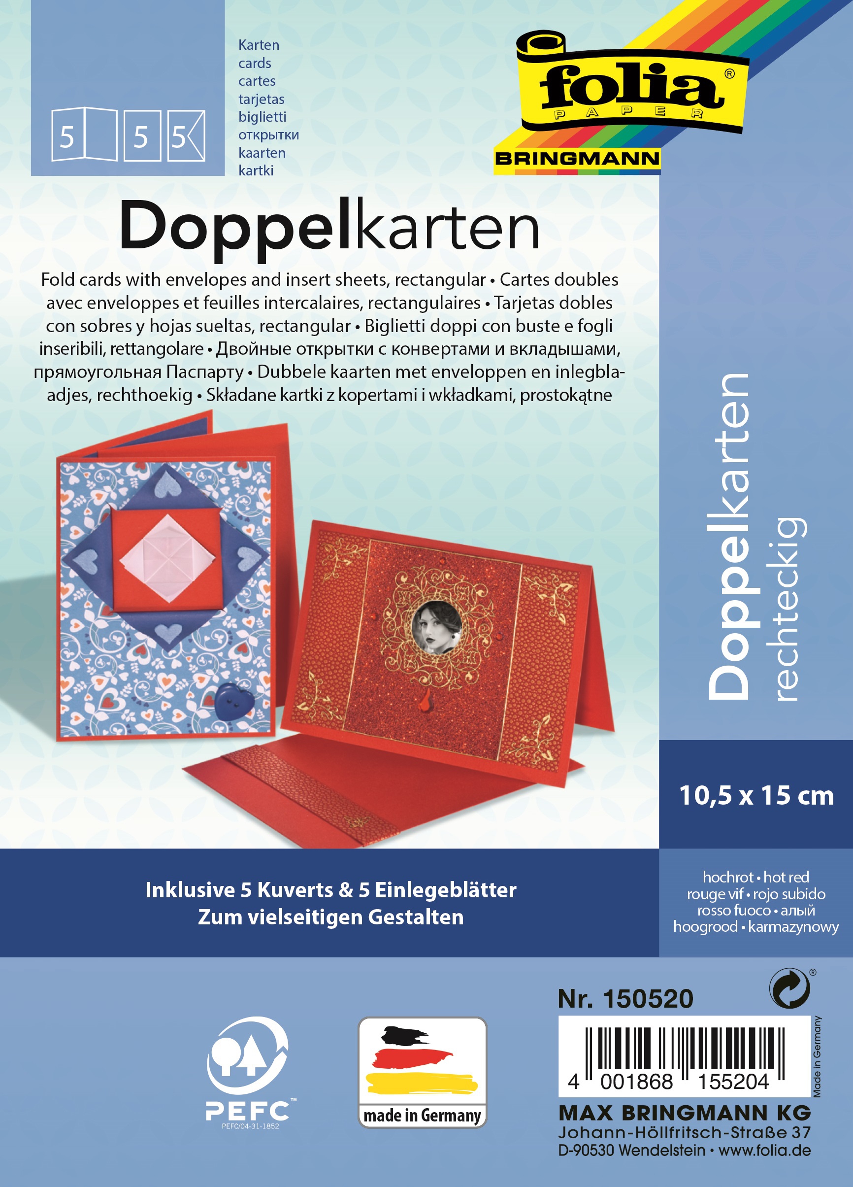 10,5 x 15 cm doppelt hoch, 5 Karten mit farblich passenden Einlegeblättern und Kuverts