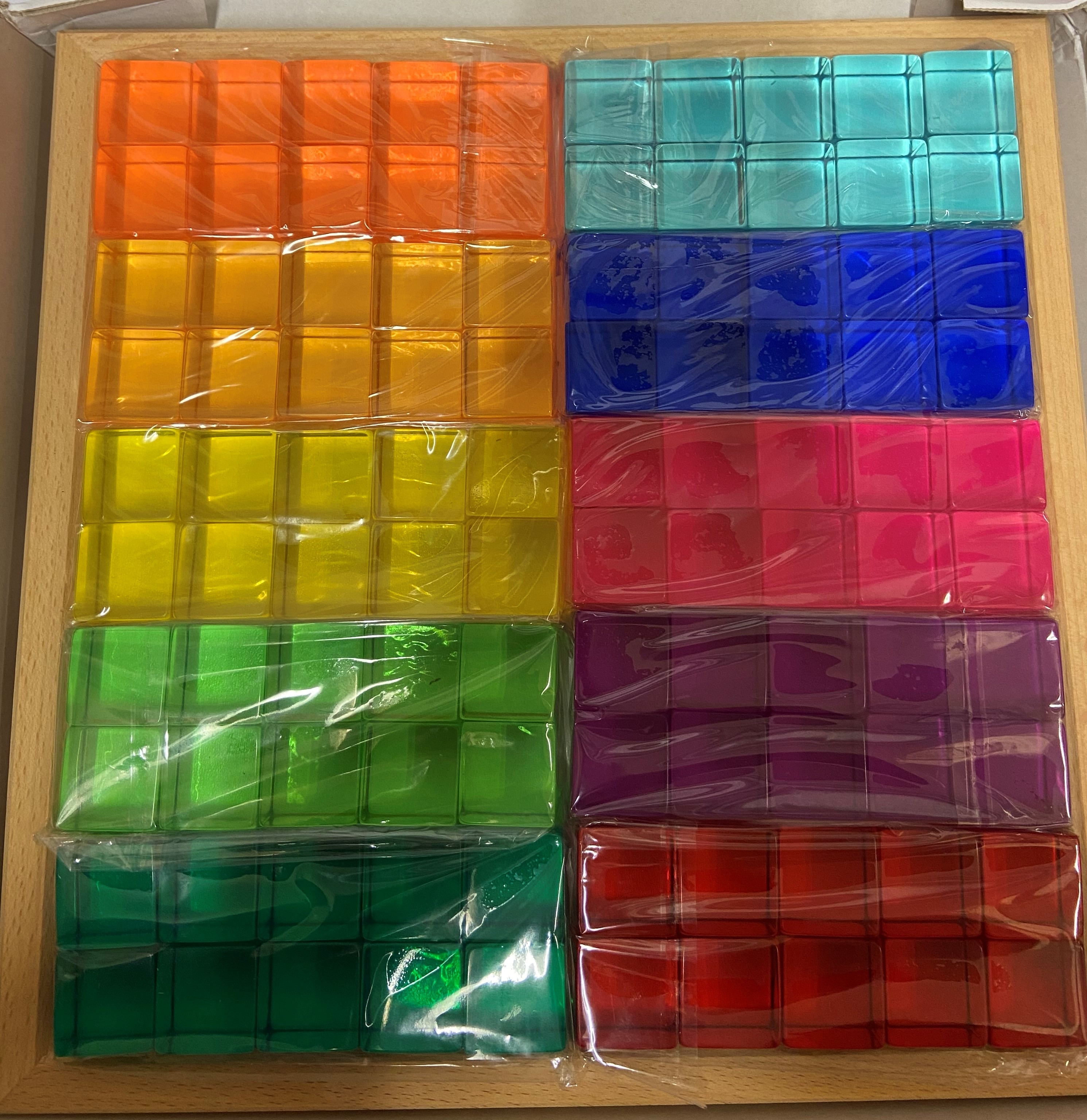100 Acryl-Bauwürfel im Holzrahmen. 10 Farben je 10 mal, wunderbar kombinierbar mit anderen Bausteinen, unterstützt das Zählen-Lernen, für Lichtplatten geeignet und ideal für die Farbenlehre.
