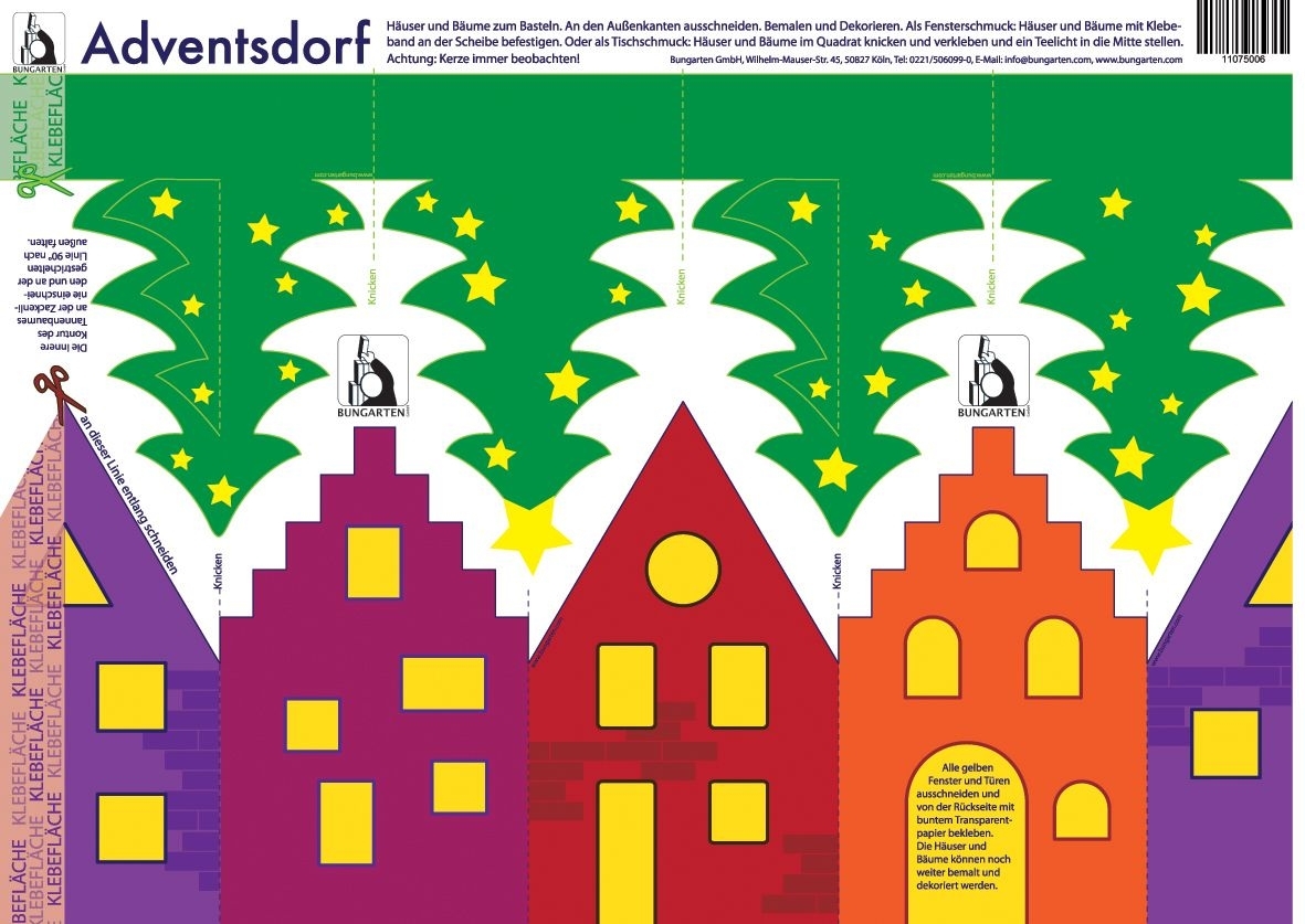 Ein schön geschmückter Wehinachtsbaum und ein hell erleuchtetes Haus zum Selberbasteln. Die ausgeschnittenen Teile lassen sich als fröhlicher Schmuck am Fenster anbringen oder als Tischdeko verwenden.