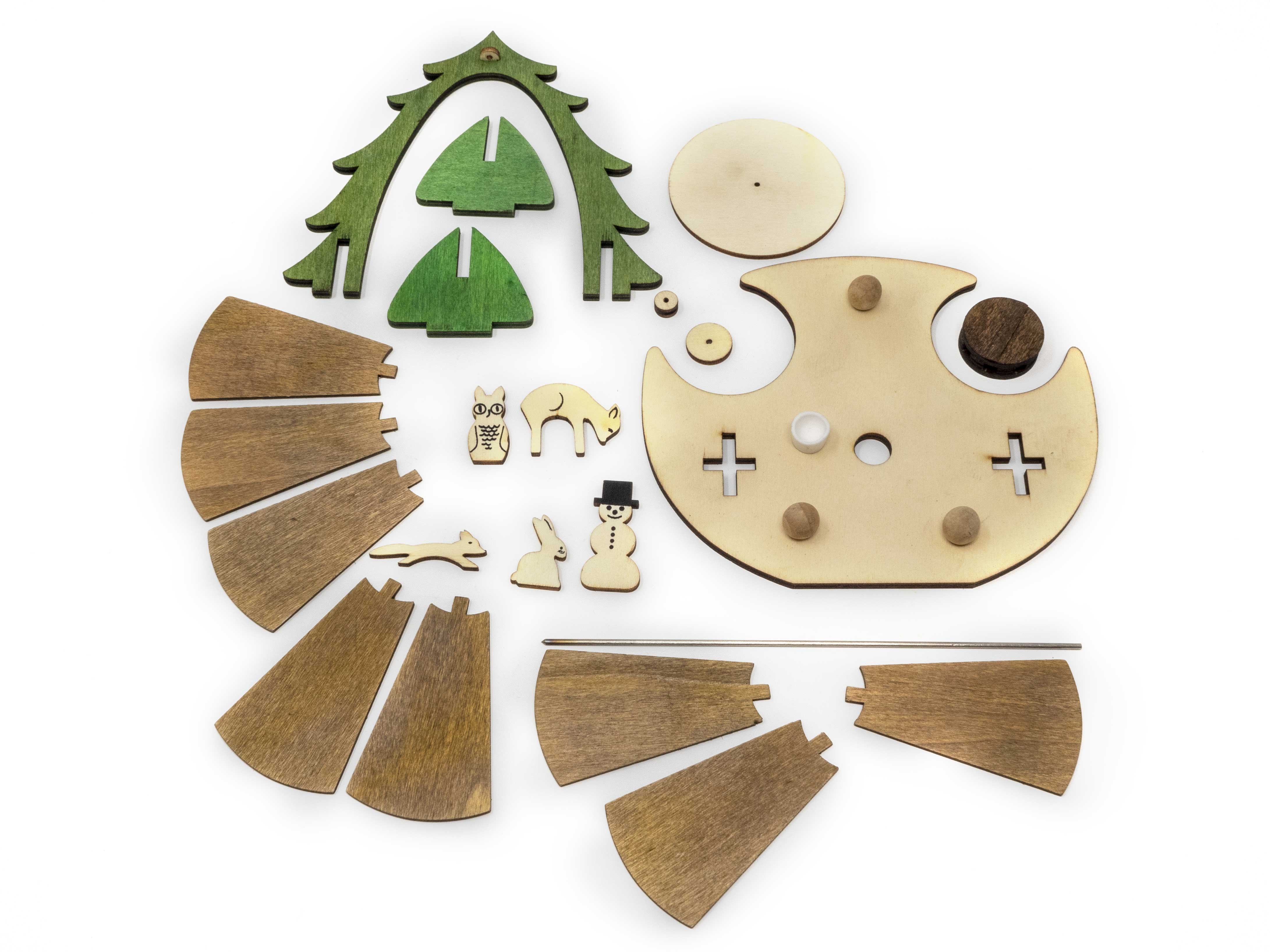 Die Teile sind aus Holz gefertigt und teilweise vorgezeichnet - z.B. die Tiere haben Augen aufgemalt.