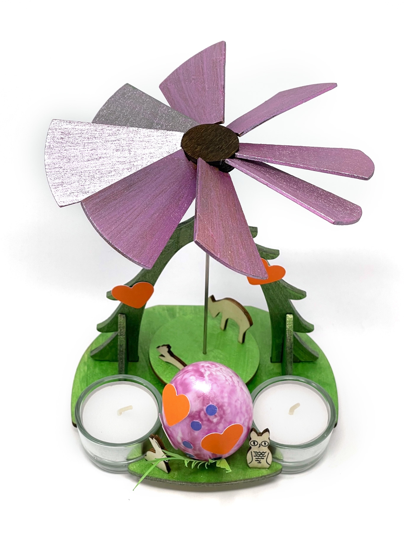 Die Frühjahrs-Pyramide ist mit Herzen beklebt, die mit unserer Stanze gemacht worden sind. Wir haben mit unserer Perlmuttfarbe "Rosa" (12023519) die Windmühlenblätter und die Plastikeier angemalt und mit "Grün" die Baumteile.
