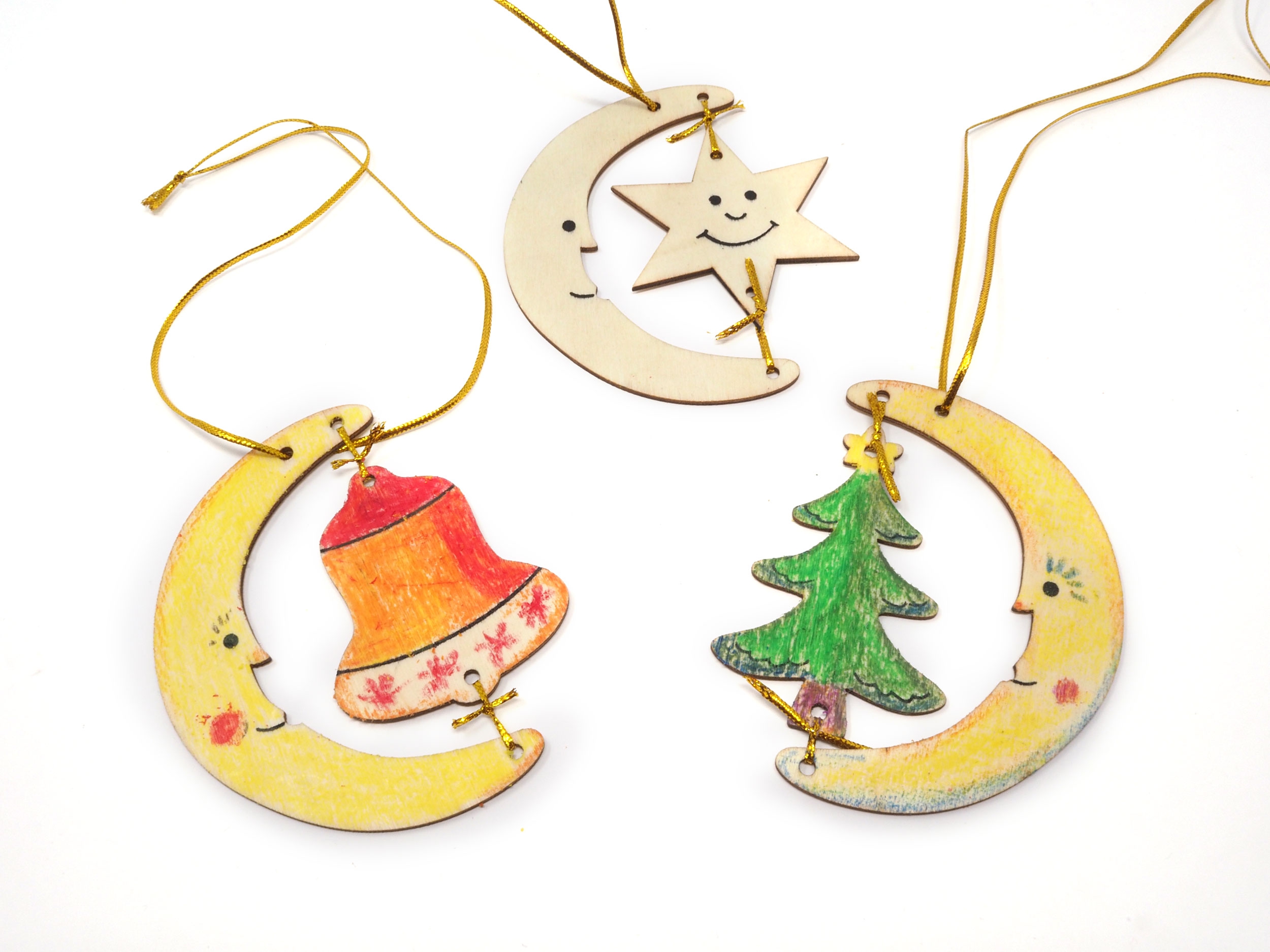können unbemalt ins Fenster oder an den Tannenbaum gehängt werden.