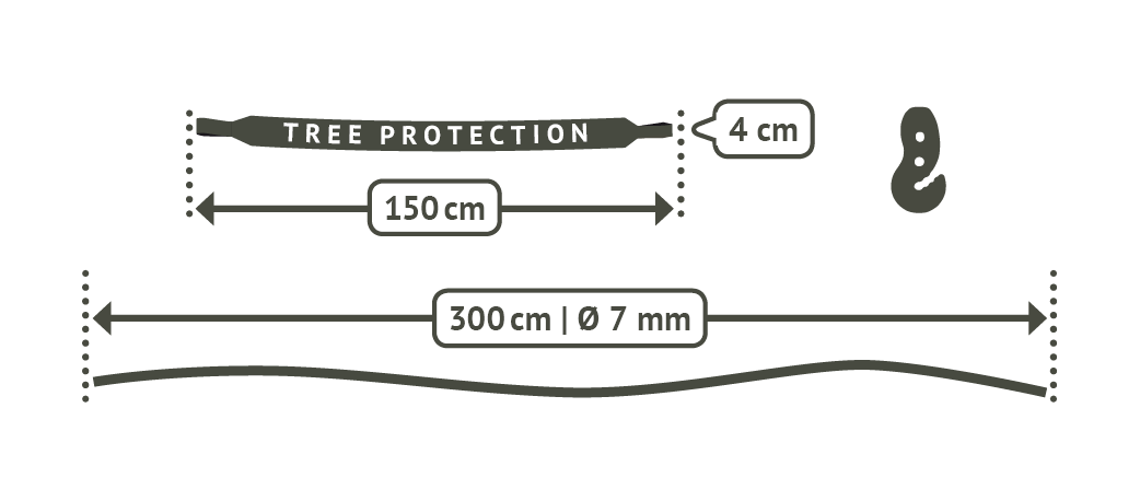 Materialbeschreibung Haken: Polyamid (glasfaserverstärkt) | TreeStrap: 100% Polypropylen | Seil: 100% Polyester