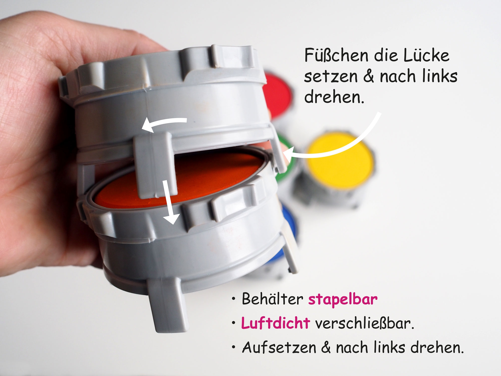 Die Behälter sind durch ihre Füße absolut standfest, lassen sich besonders von Kinderhänden einfach benutzen, können individuell zusammengesteckt, leicht gesäubert und nach getaner Arbeit ineinander gestapelt werden.