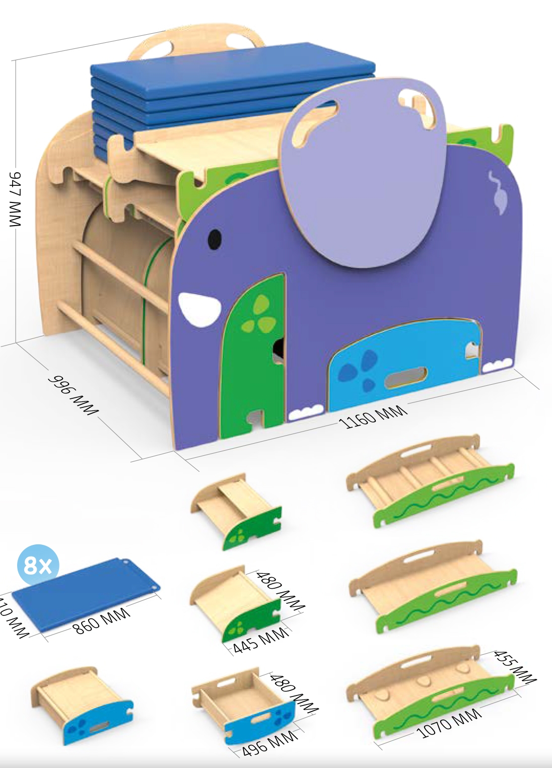 Inhalt: Elefant, Krokodil - Rutsche, Krokodil - Sprossenleiter, Krokodil - Kletterwand, Rhino - Rutsche, Rhino - Treppe, Hippo, 8 Bodenmatten