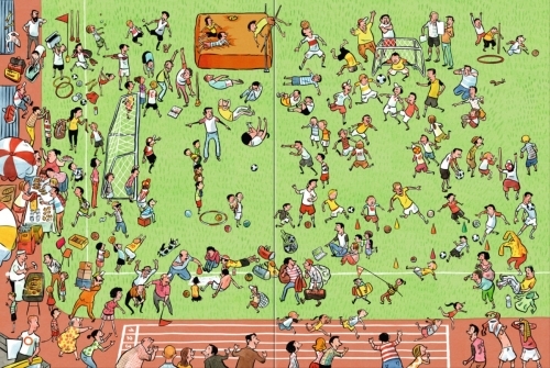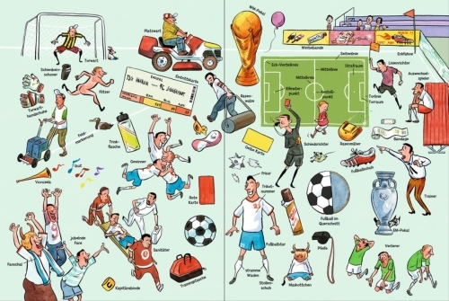 Die großen Wimmelbilder zeigen den turbulenten Trainingsplatz, spannende Höhepunkte eines Spitzenspiels, begeistertes Public Viewing, Elfmeterschießen und die große Finalfeier.