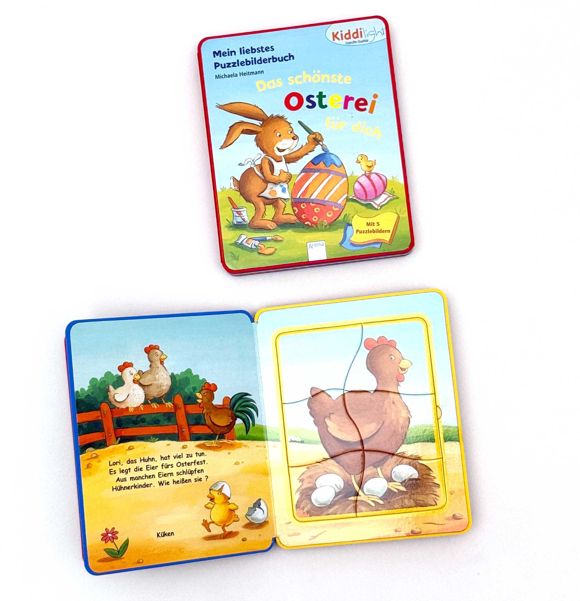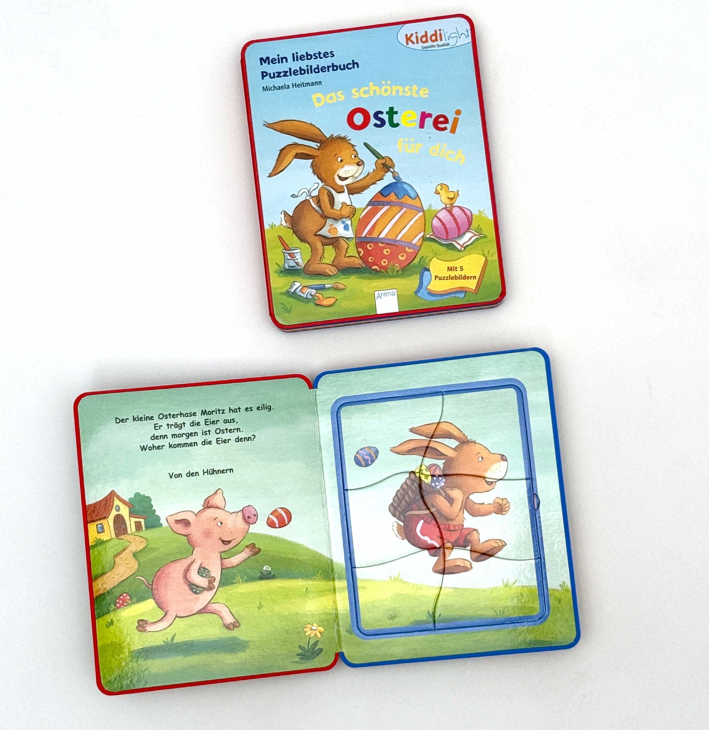 12 Buchseiten aus dicker Pappe mit 5 Puzzle-Seiten.