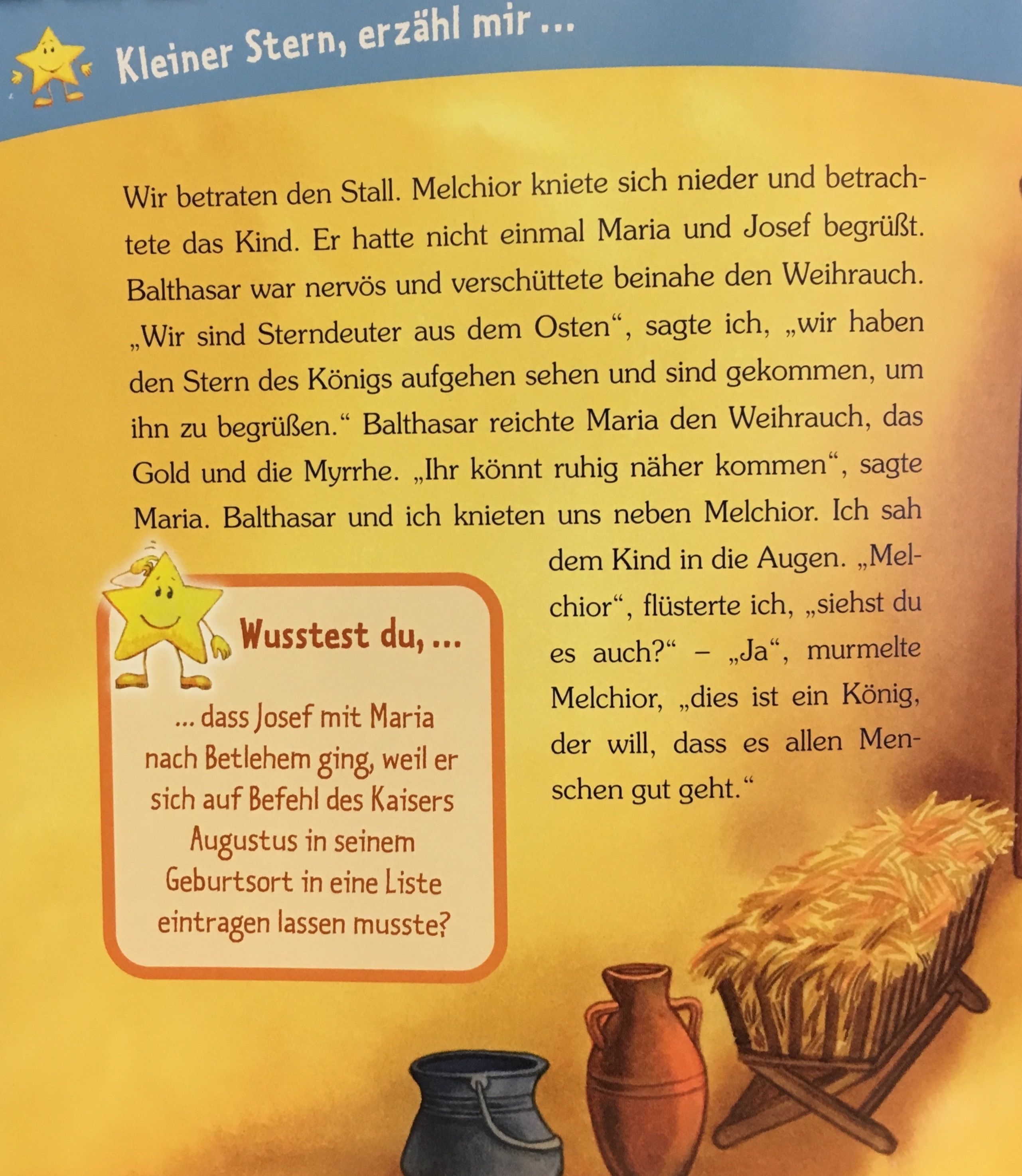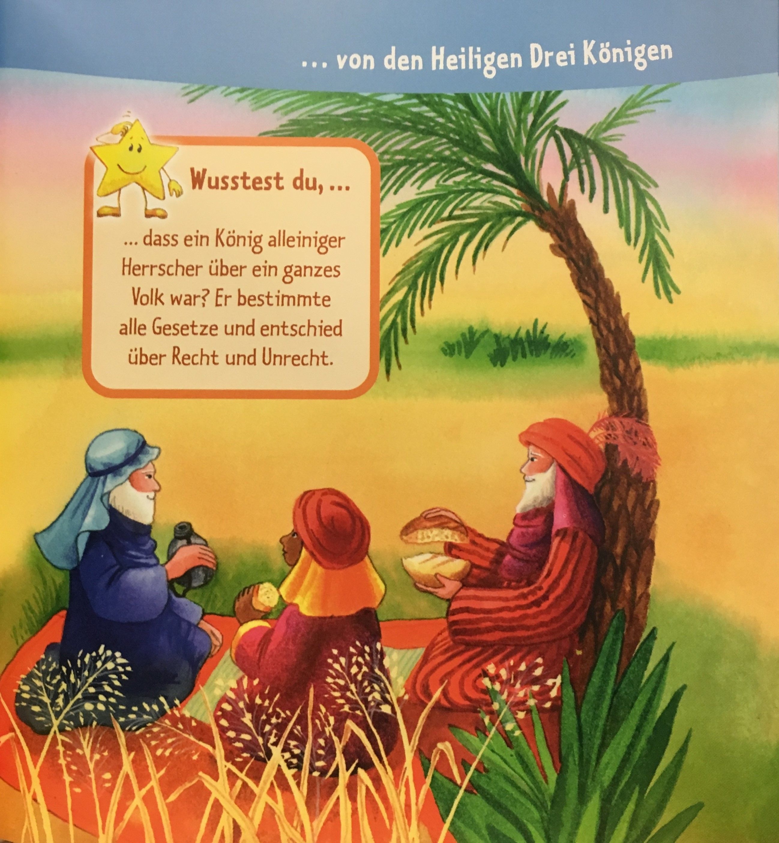 Neben der Vorlesegeschichte enthält das Buch kindgerecht aufgearbeitetets Sachwissen und spannende Fragen rund um die Heiligen Drei Könige: Waren es Sterndeuter oder Könige, die zur Krippe kamen? Welche Bräuche gibt es in Deutschland und anderen Ländern zum Dreikönigstag?