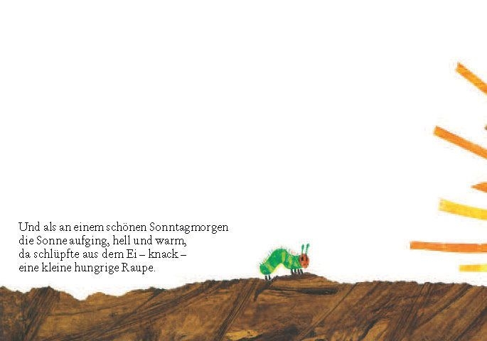 Die Kleine Raupe schlüpft aus dem Ei und hat nur noch Fressen im Sinn. Eine Woche lang frisst sie sich durch allerlei Obst und Süßigkeiten und hinterlässt Fraßspuren auf den Buchseiten. Dann baut sie sich einen Kokon und entpuppt sich als farbenprächtiger Schmetterling. Spielerisch kann das Kind mitzählen und lernt die Wochentage kennen. Die farbenfrohen, collageähnlichen Bilder und der kurze, humorvolle Text sind bereits für kleine Kinder gut zu begreifen. Millionenfach verkauft!