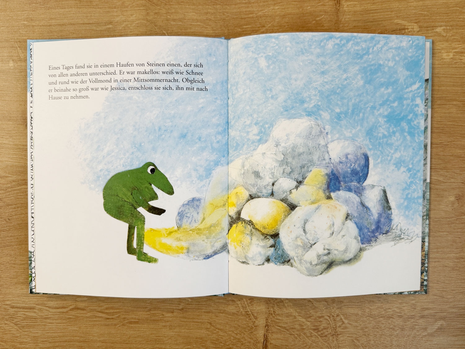 Dieser Frosch heißt Jessica. Eines Tages findet Jessica einen makellosen weißen Stein.