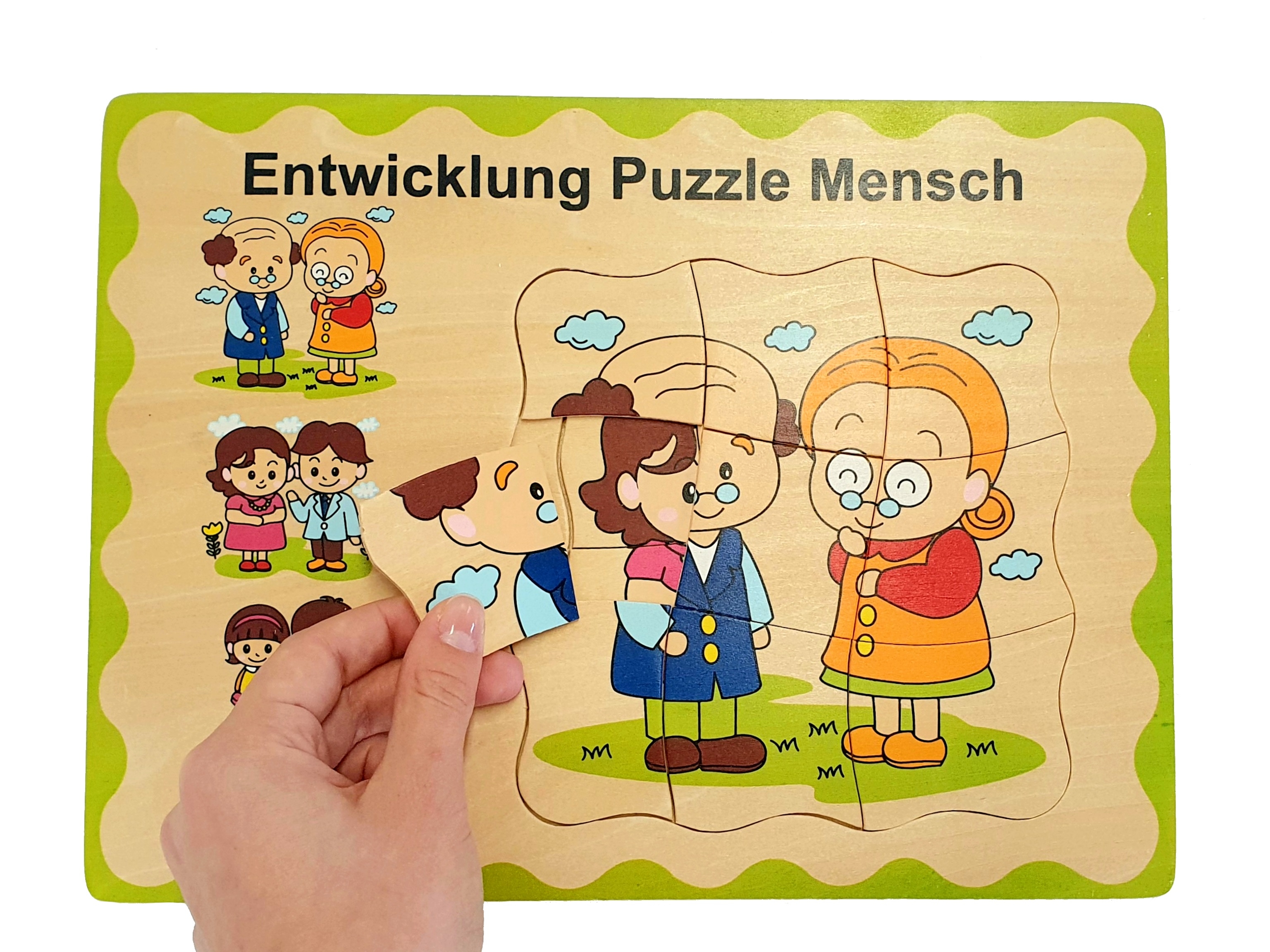 3 verschiedene Puzzles, die jeweils 4 Entwicklungsphasen wiedergegeben. Auf den vier Lagen wird die Altersentwicklung dargestellt.