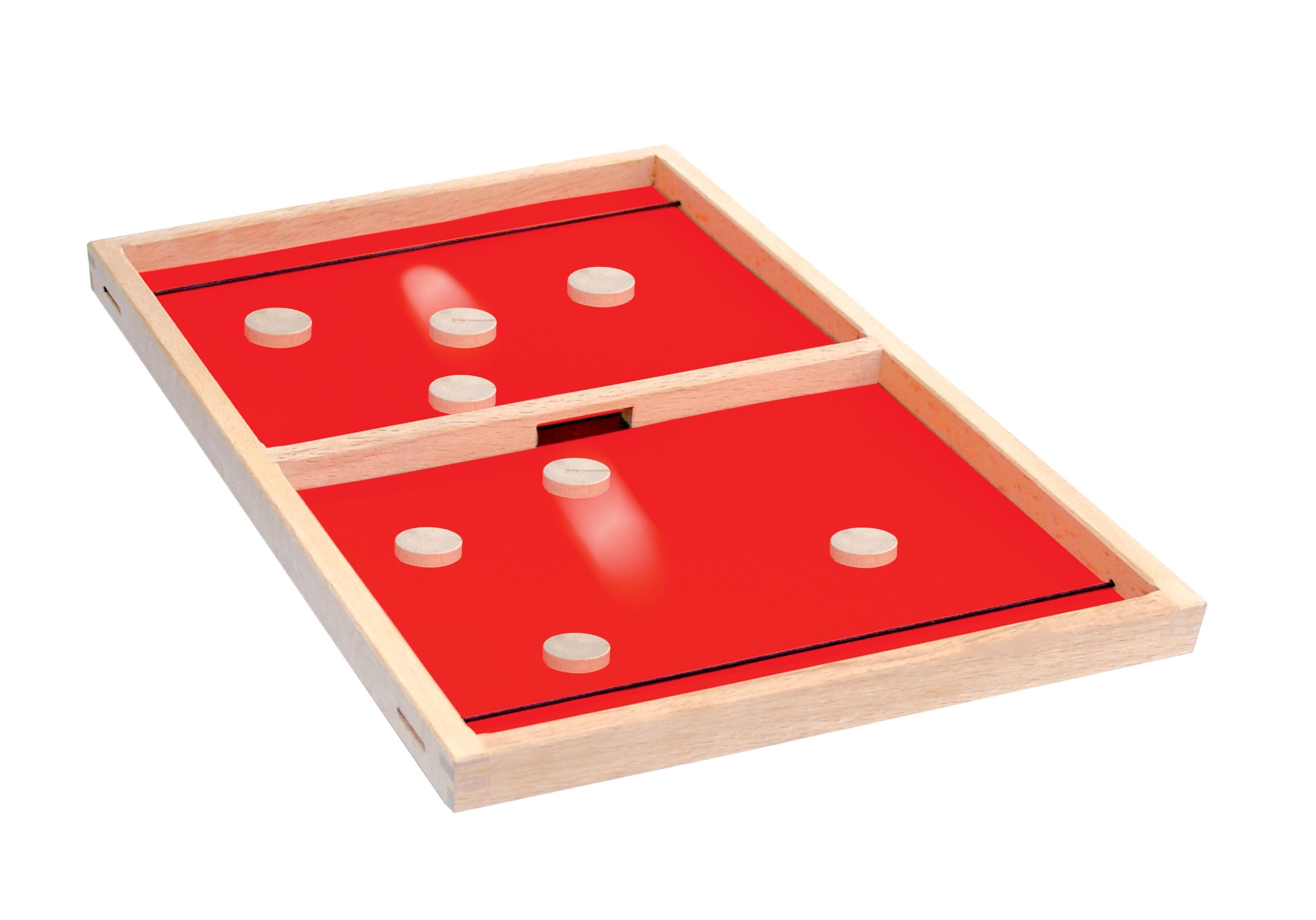 Beim Spielbeginn versucht jeder gleichzeitig seine Scheiben durch die Öffnung in das gegnerische Spielfeld zu schießen.