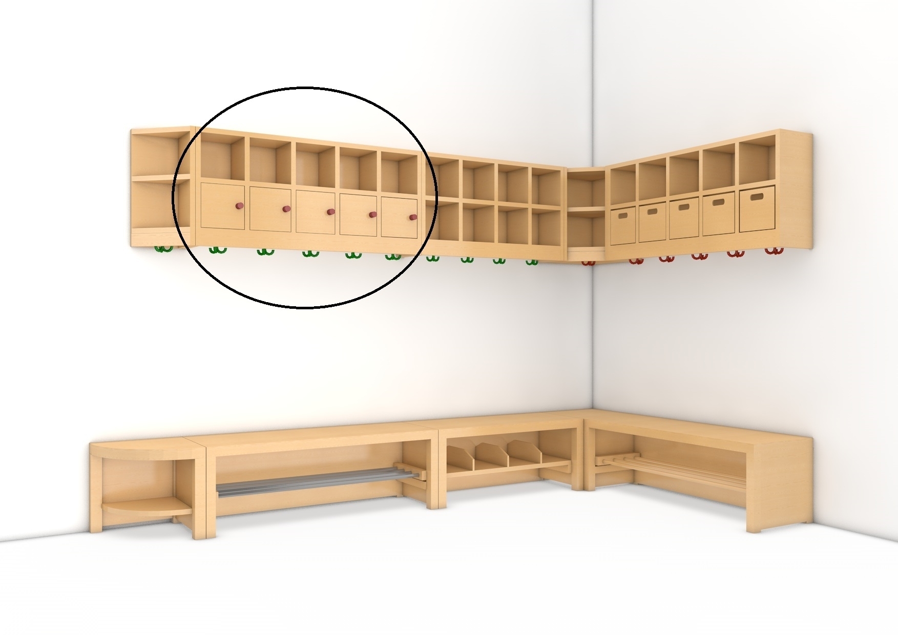 pro Platz 1 offenes Fach oben, darunter 1 Tür und 1 Dreifachhaken (auch mit Tür oben und offenes Fach unten bestellbar)