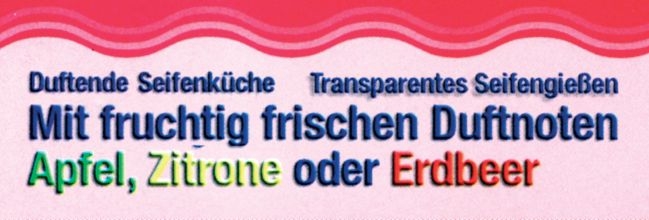 Set bestehend aus: 250g transparente Seifenmasse, 4 x 25g Seifencolorant mit Duft, 1 Satz Schiffchen, 4 Fahnenpicker, 1 Schmelzkelle, 2 Gießformplatten
