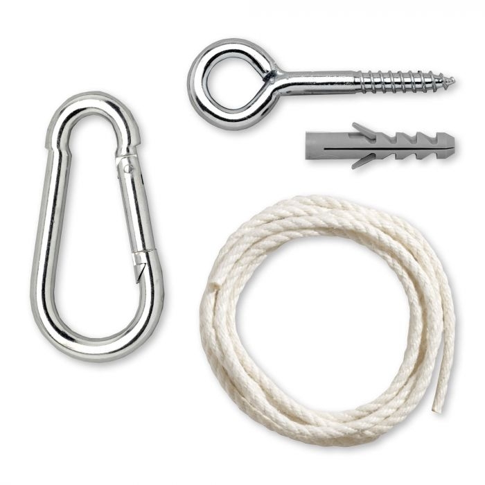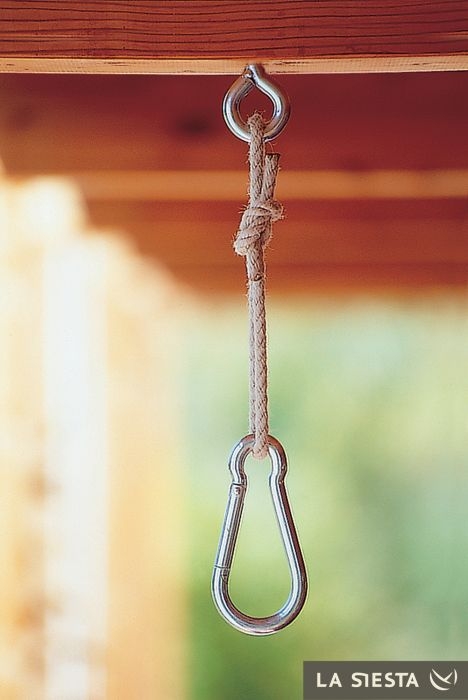 für Hängestühle an Zimmer- bzw. Terassendecken, bestehend aus Ringhaken mit Dübel, 3 m Seil, Karabinerhaken