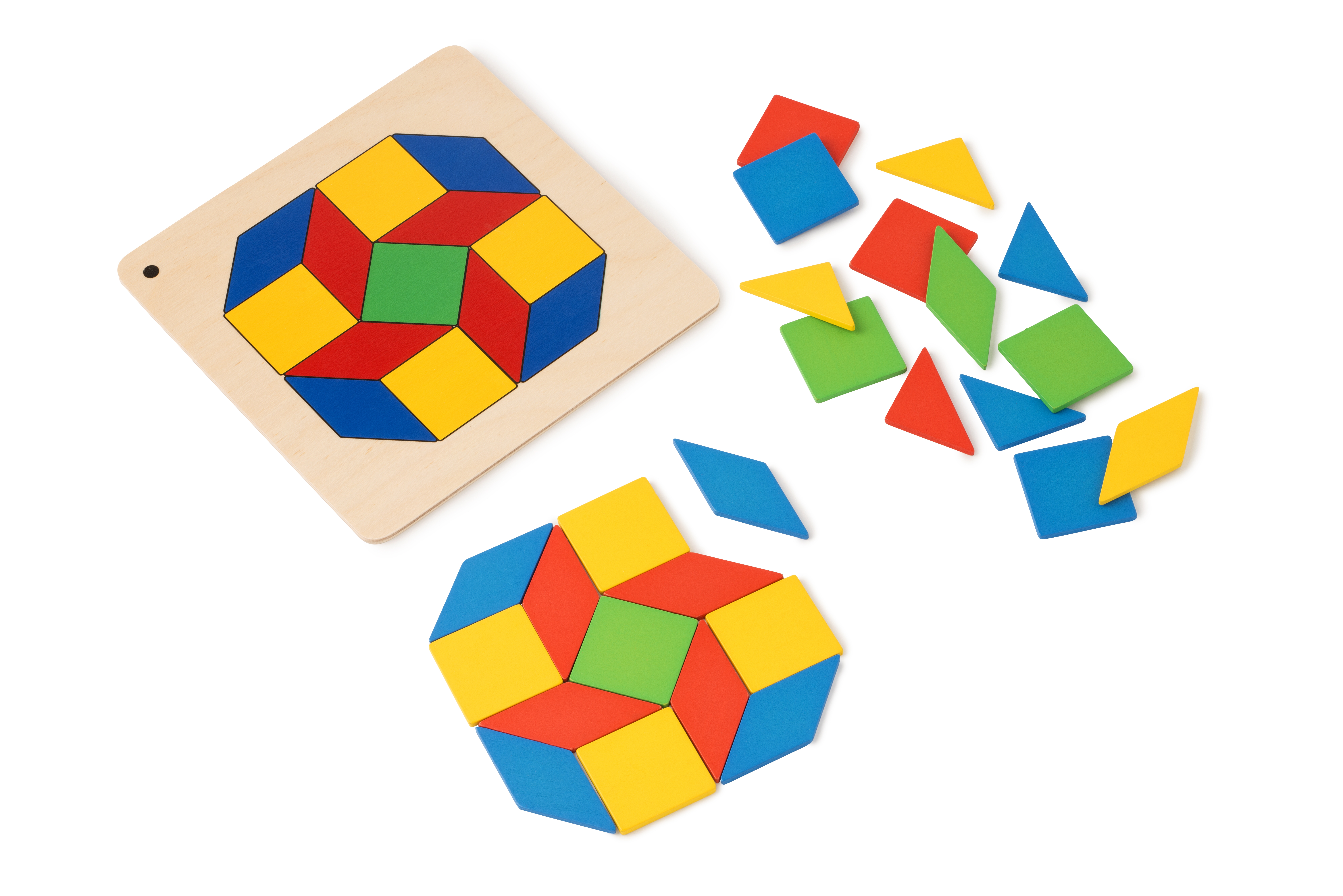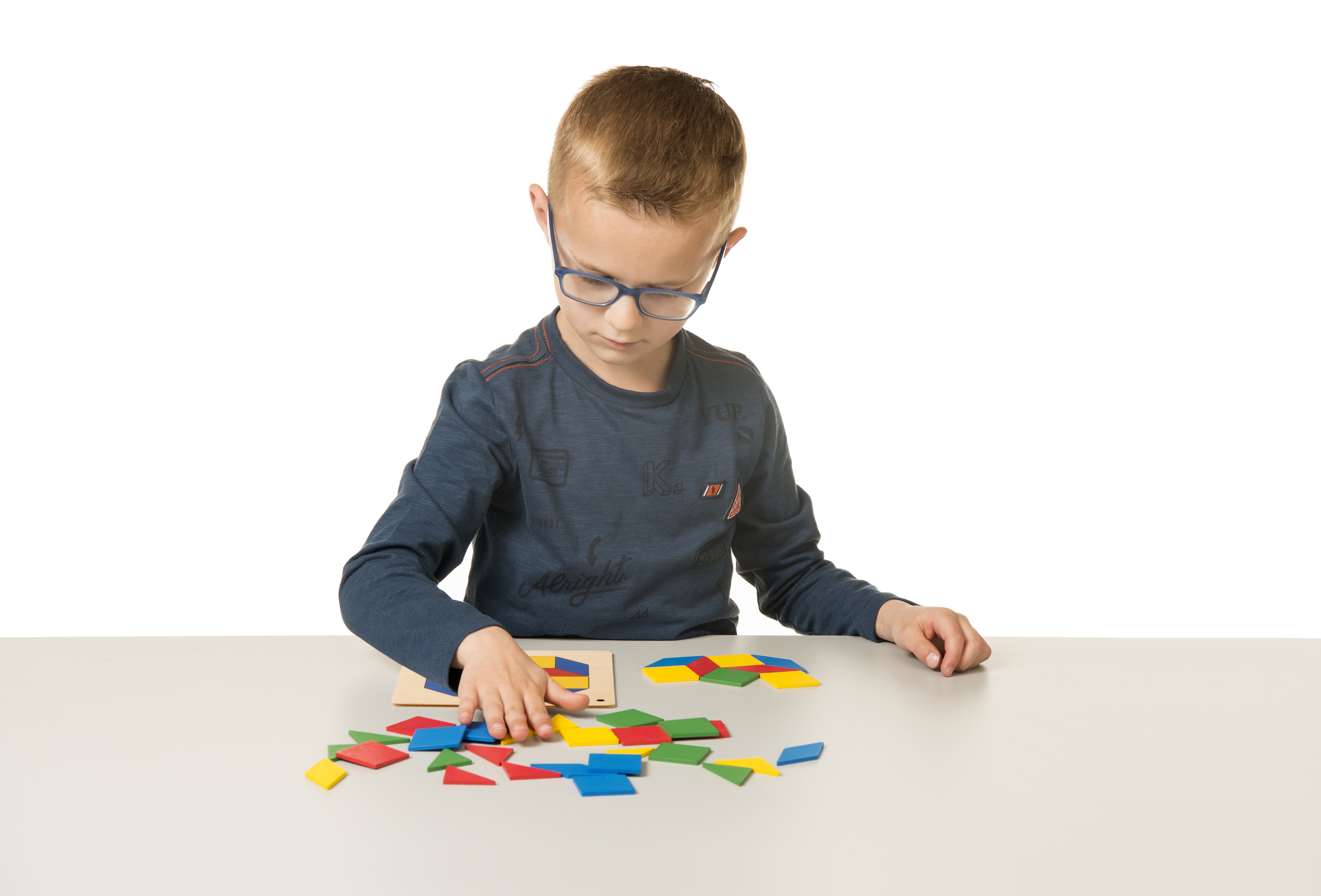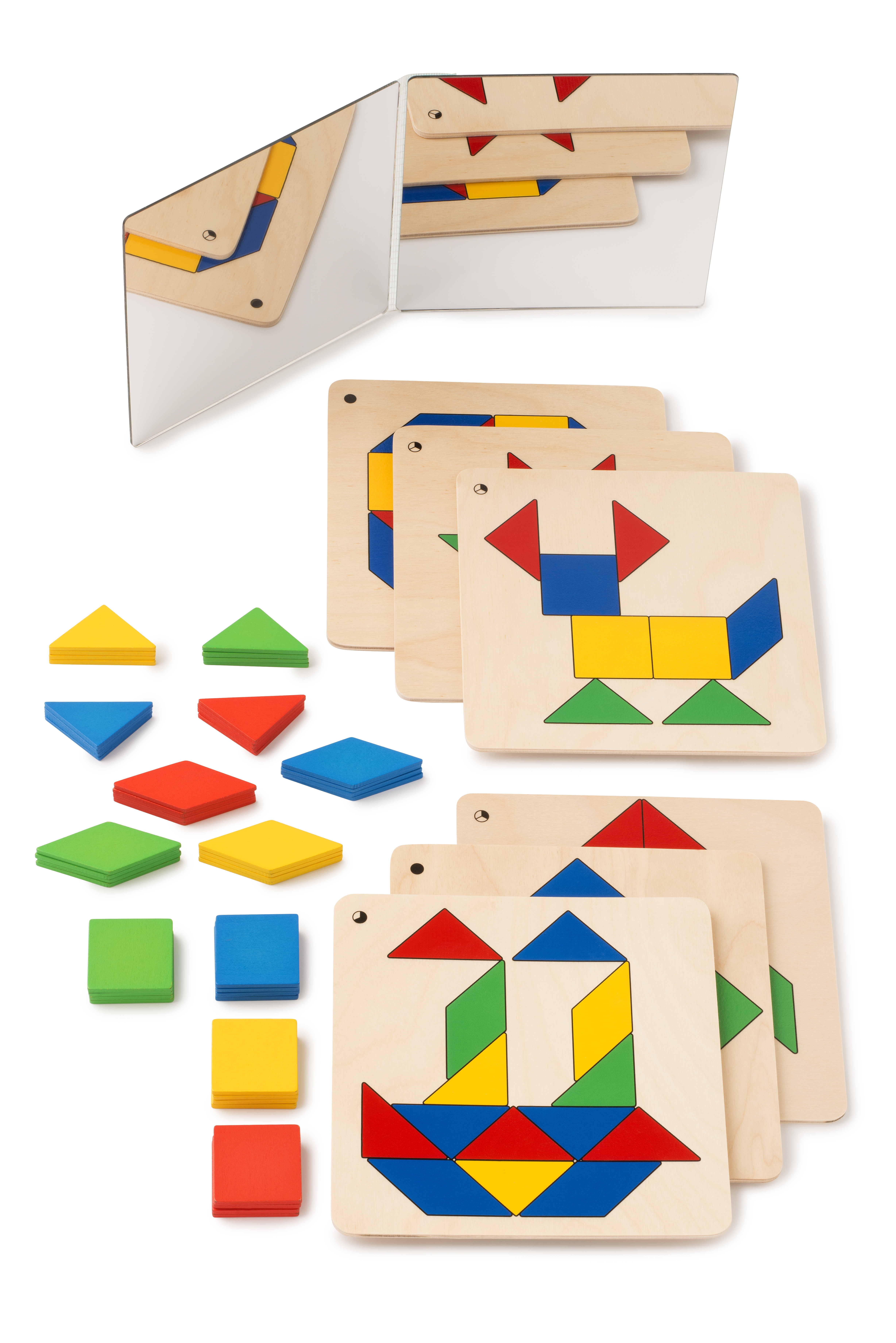 Muster mit geometrischen Formen in unterschiedlichen Farben erstellen. Eine der Aufgabenkarten nachmachen oder eigene Kreationen erfinden. Eine größere Herausforderung bildet die Arbeit mit einem Spiegel. Fördert Feinmotorik und das räumliche Orientierungsvermögen.
