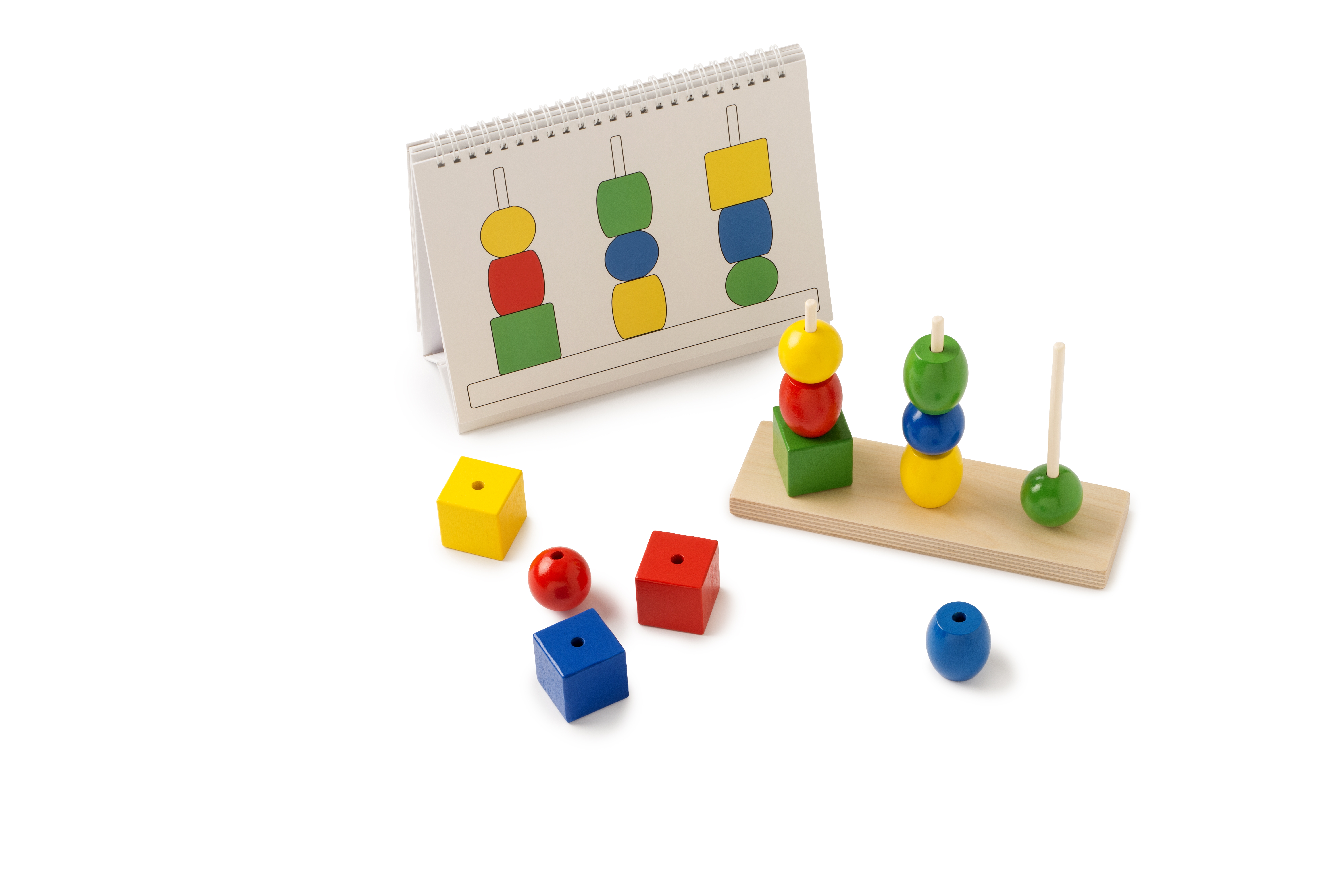 Türme nach dem Vorbild auf den Aufgabenkarten bauen. Dabei das Erkennen verschiedener Formen und Farben sowie die Umsetzung eines 2D-Bildes in eine 3D-Figur üben. Fördert Auge-Hand-Koordination und Feinmotorik.