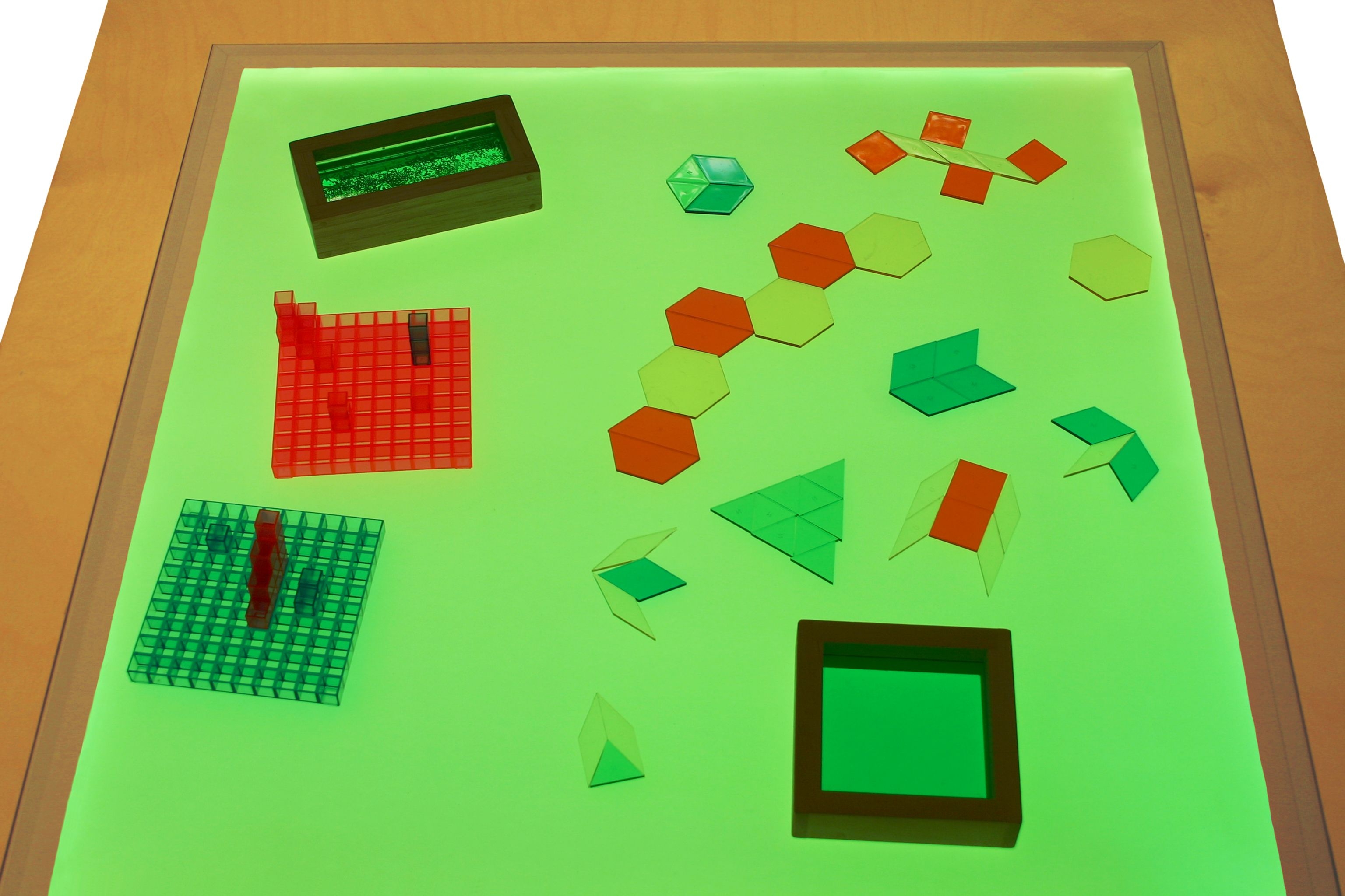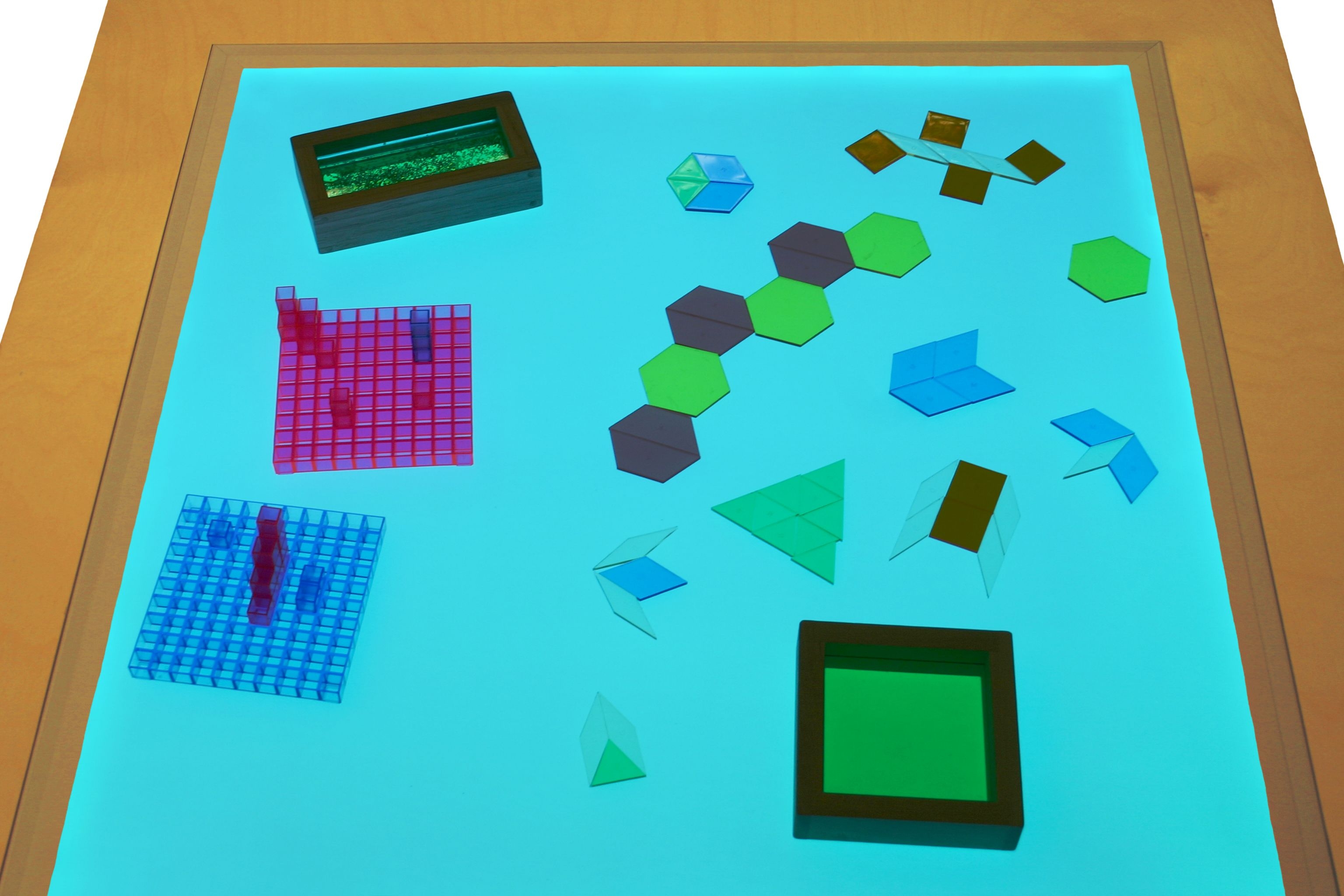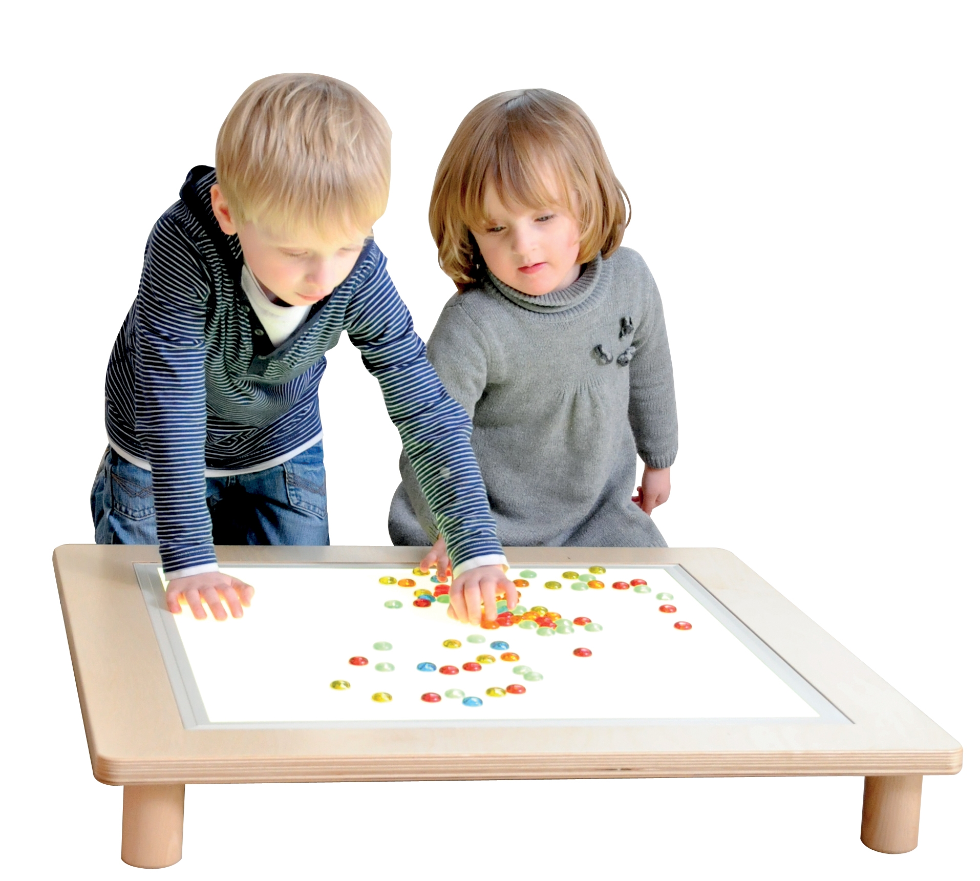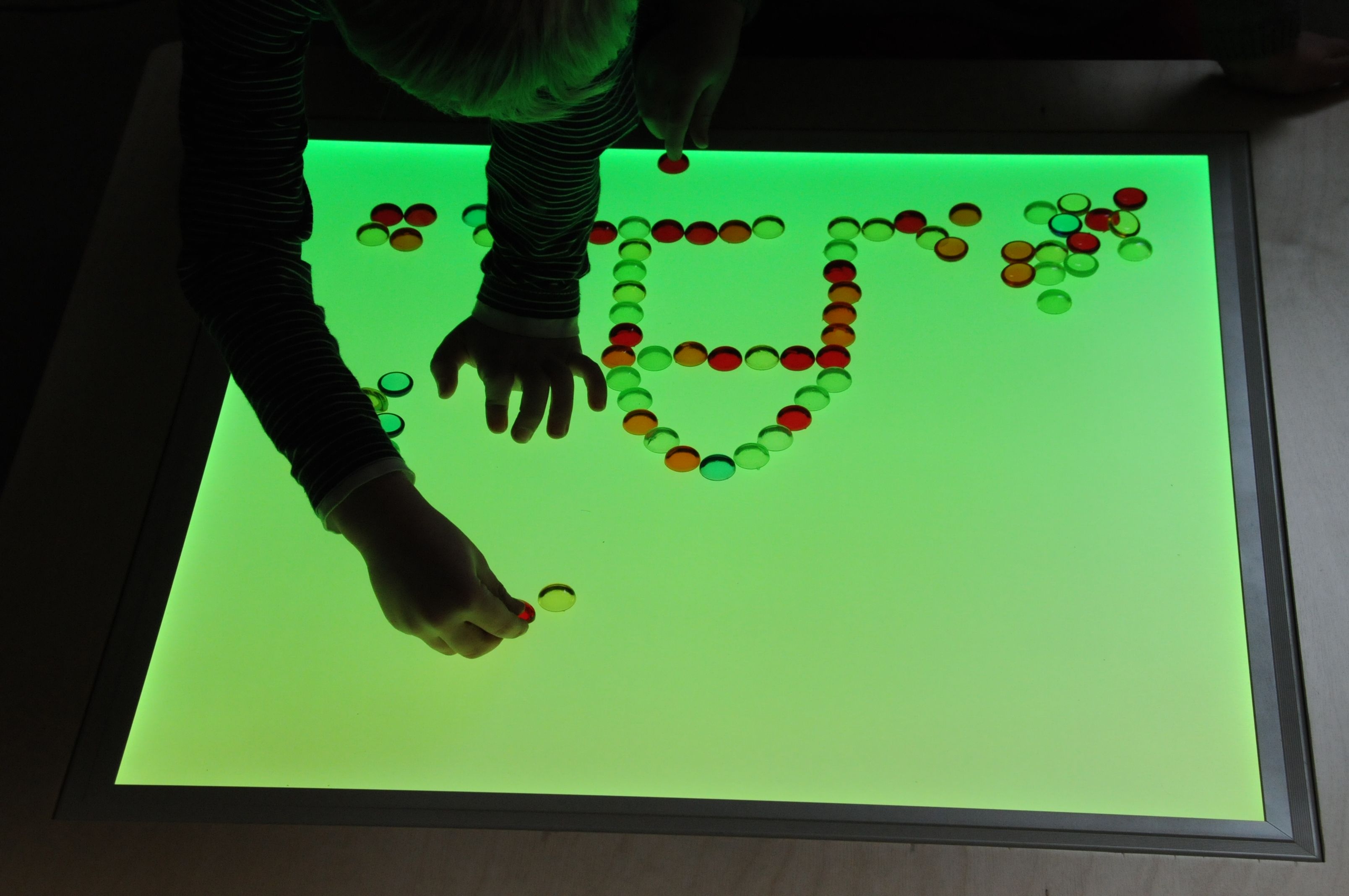 Hier können sich Kreativität und Fantasie der Kinder spielerisch wundervoll entwickeln: egal ob mit durchscheinenden Muggelsteinen, mit denen sich tolle Muster oder Landschaften legen lassen, oder mit Glasmurmeln, die beim Rollen ein prächtiges Farbspiel entstehen lassen. Daneben lässt sich der Leuchttisch einsetzen, um auf Papier zu malen, mit Transpatentpapier Muster zu entwerfen, Dias zu betrachten, Vorlagen durchzupausen..... Die flachen Leuchtpaneele mit LED-Technik (55 x 55 cm) sind in einem Rahmen aus Buchenholz (75 x 75 cm) eingelassen und besitzen 4 kurze Füße. Die farbig/weiße Version ist mit einer Fernbedienung ausgestattet, mit der sich alle Farben stufenlos einstellen lassen.