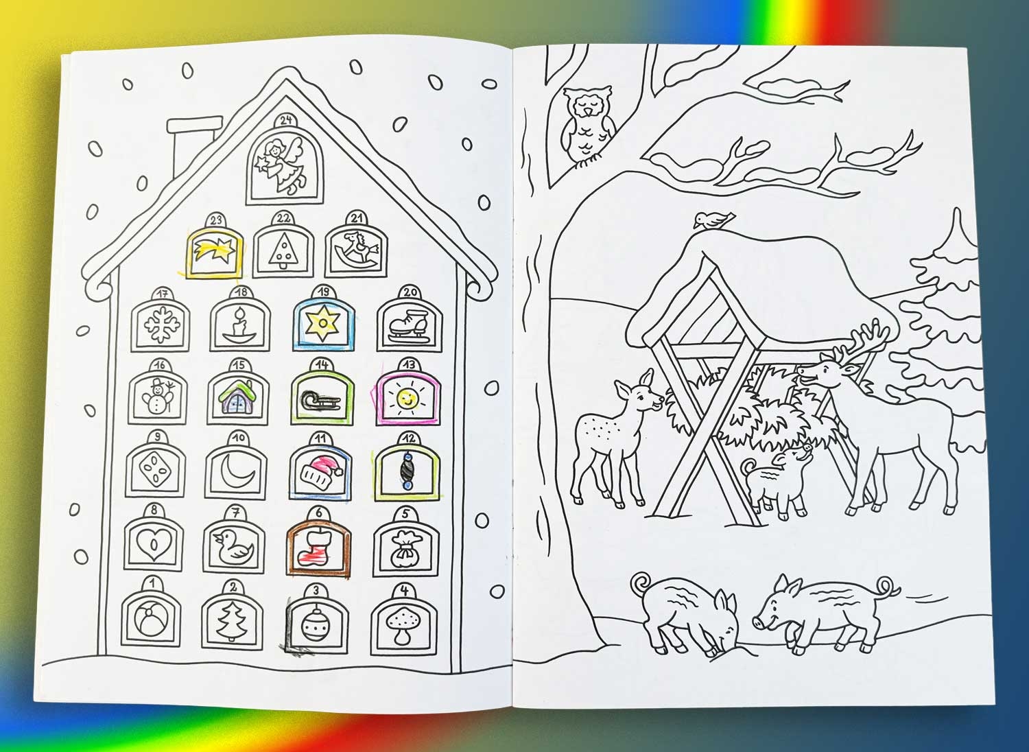 Tief verschneite Landschaften, weihnachtlich geschmückte Häuser und natürlich der Weihnachtsmann warten darauf, von den kleinen Künstlern ausgemalt zu werden.