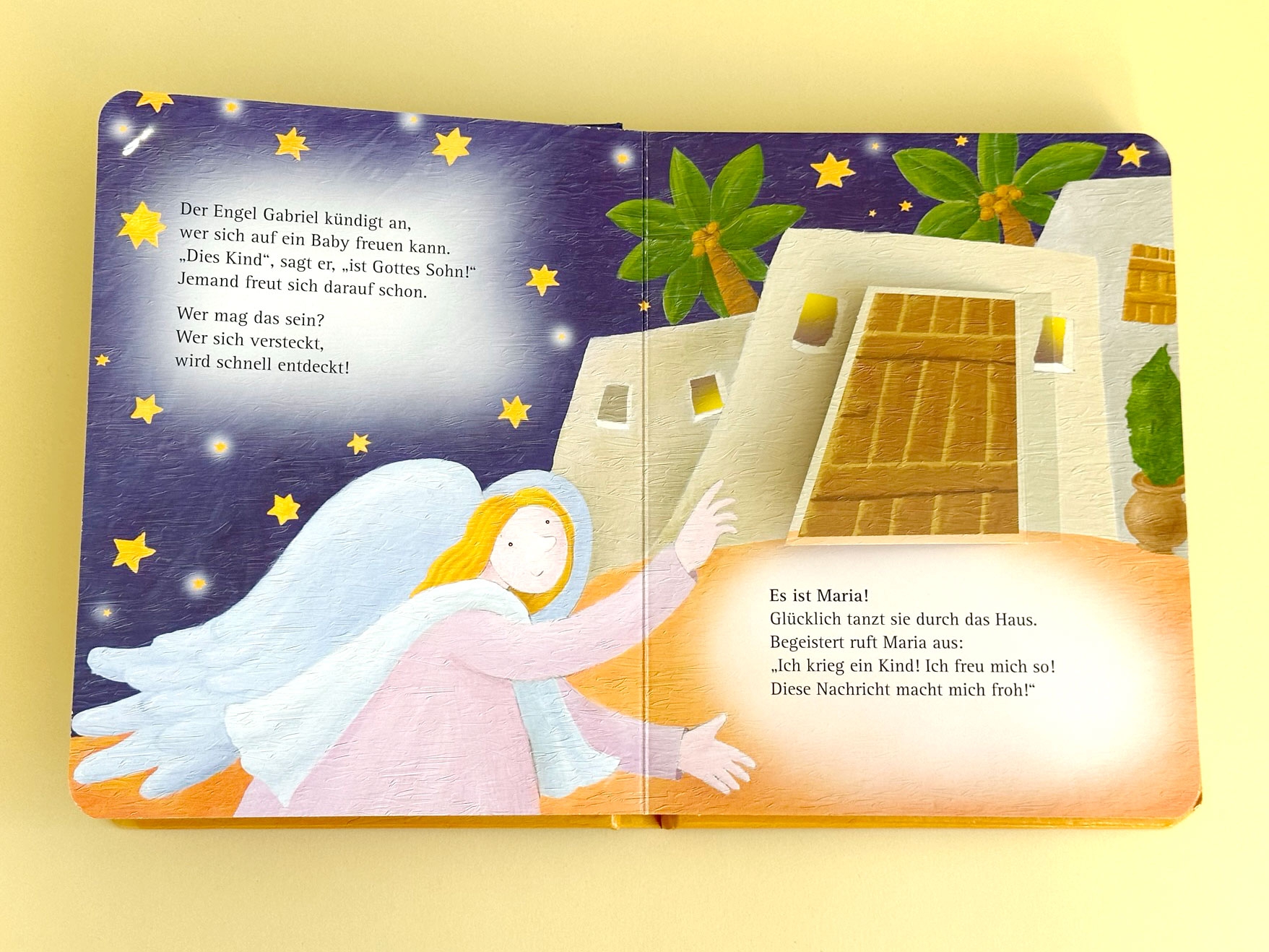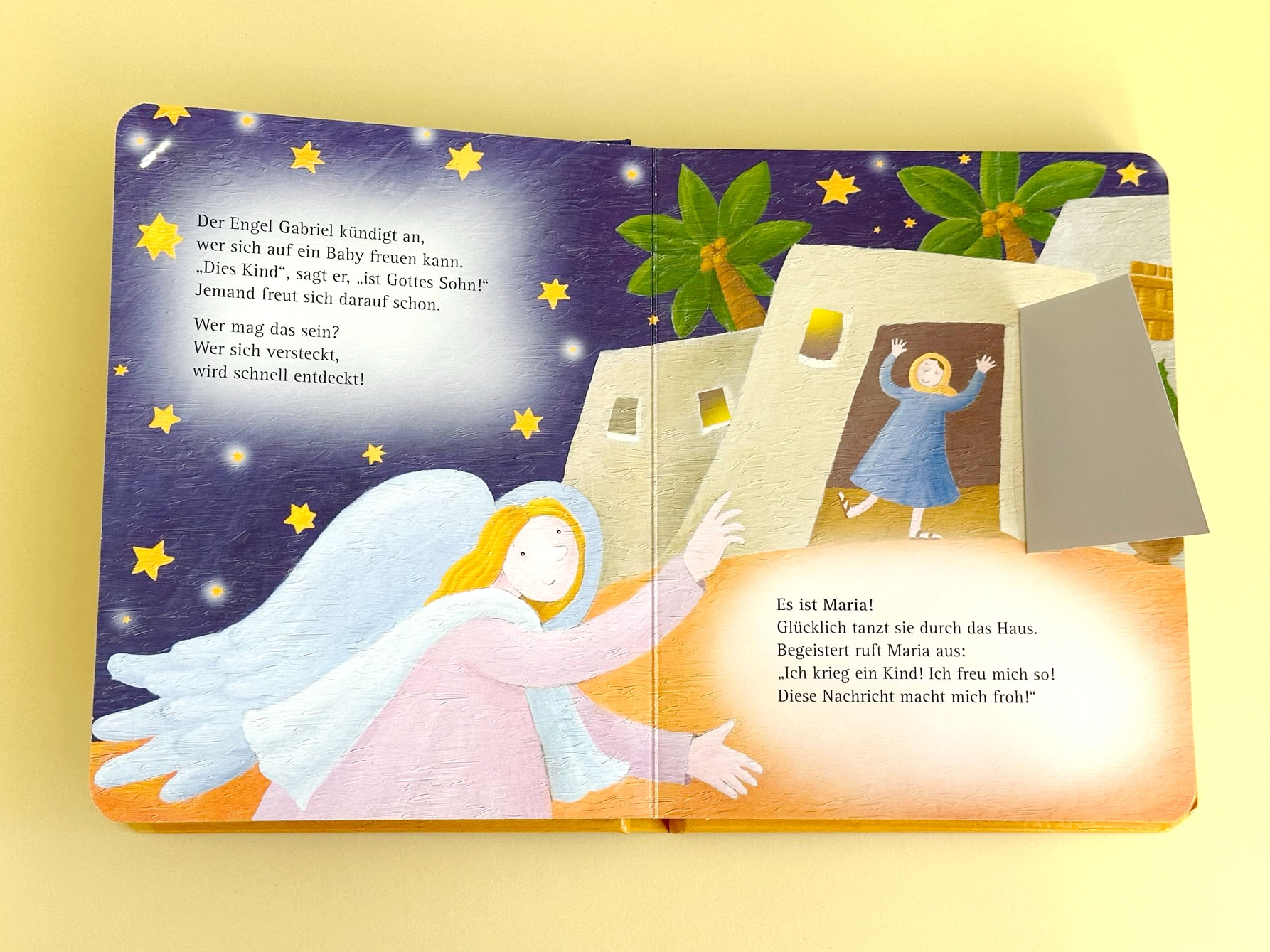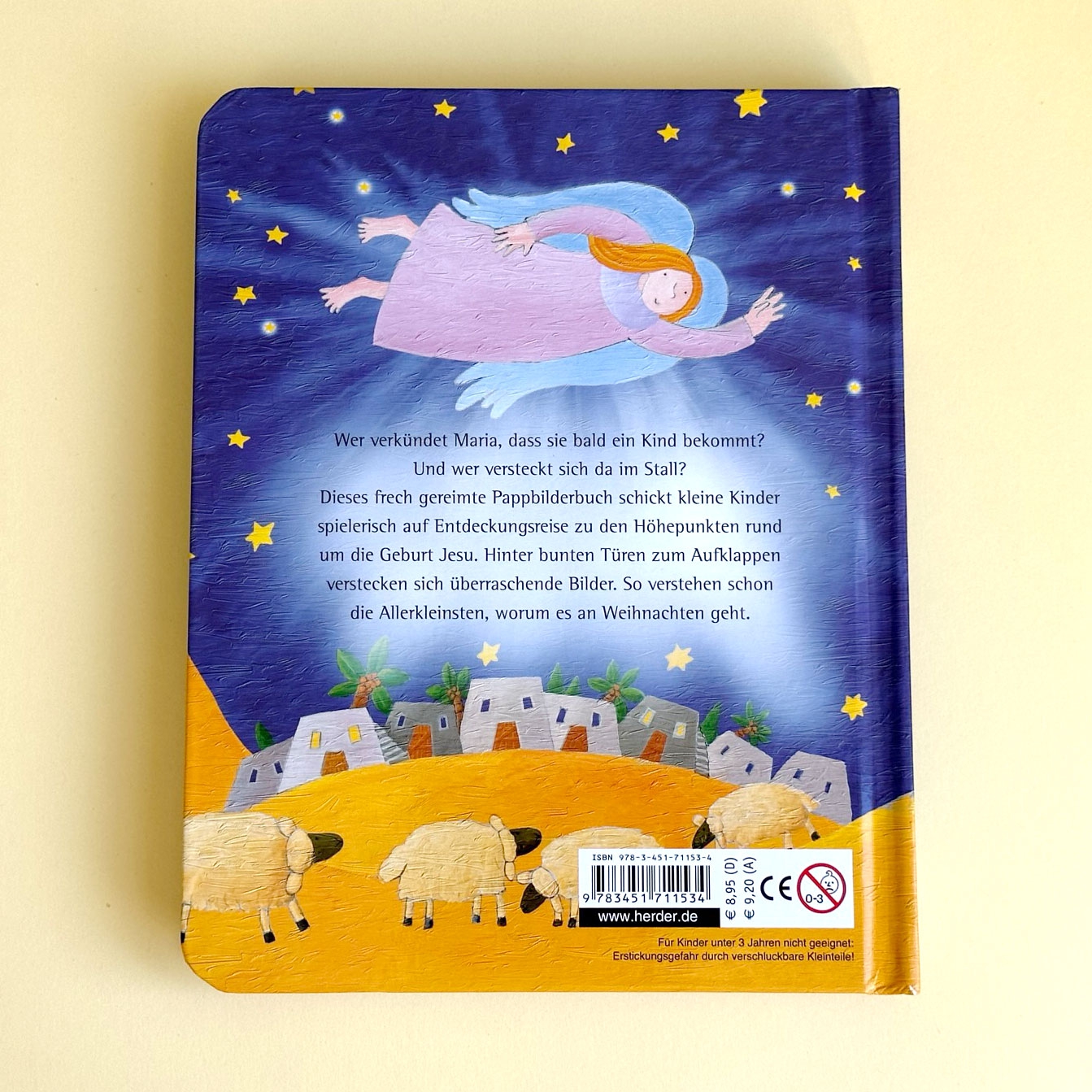 Wer verkündet Maria, dass sie bald ein Kind bekommt? Und wer versteckt sich da im Stall? Dieses frech gereimte Pappbilderbuch schickt kleine Kinder spielerisch auf Entdeckungsreise zu den Höhepunkten rund um die Geburt Jesu. Hinter bunten Türen zum Aufklappen verstecken sich überraschende Bilder. So verstehen schon die Allerkleinsten, worum es an Weihnachten geht.