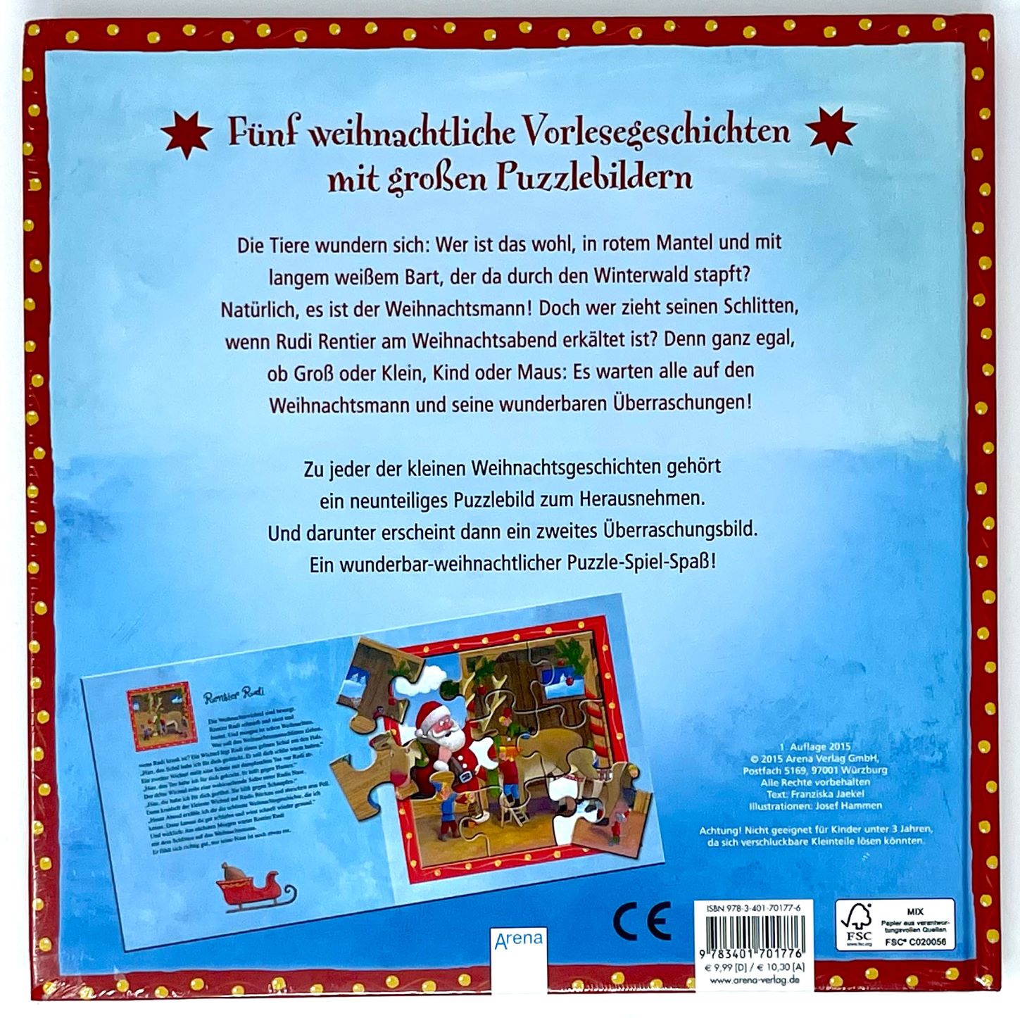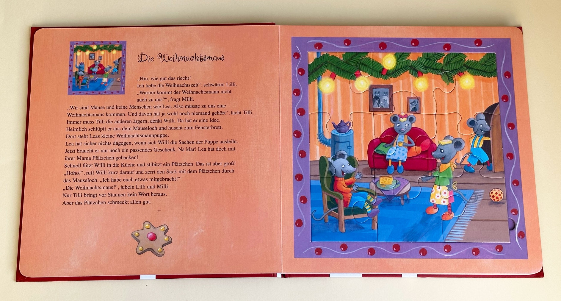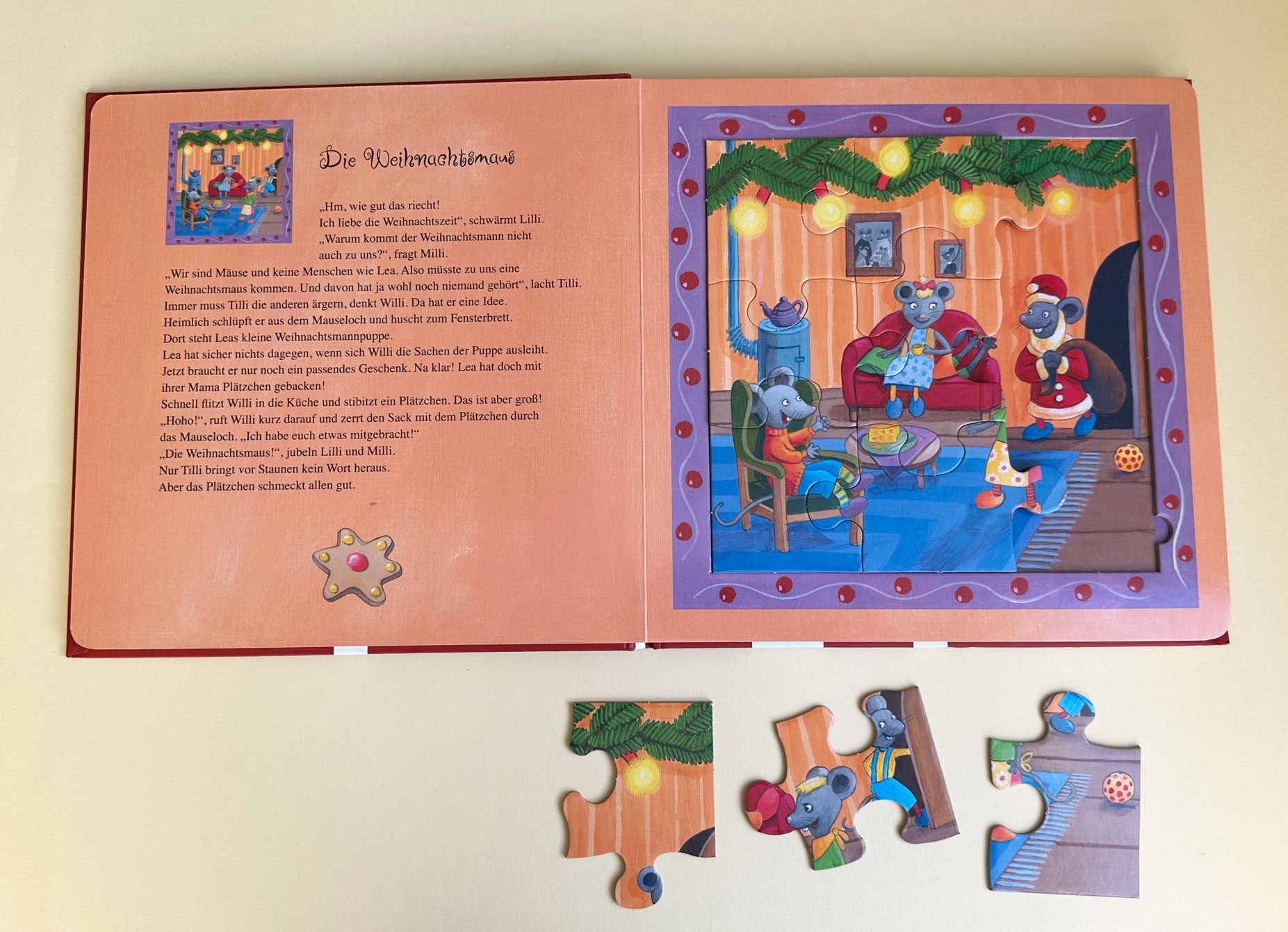 Zu jeder der kleinen Weihnachtsgeschichten gehört ein neunteiliges Puzzlebild zum Herausnehmen. Und darunter erscheint dann ein zweites Überraschungsbild. Ein wunderbar-weihnachtlicher Puzzle-Spiel-Spaß!