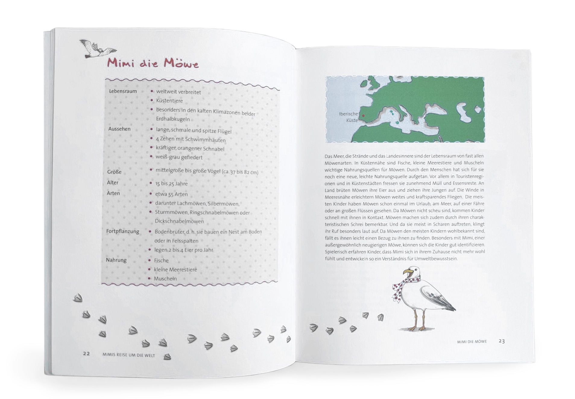 Mimi die Möwe fliegt zu unterschiedlichen Tieren auf die Erde und bringt deren Lebensräume und Umweltfragen anhand von Liedern, Geschichten, Bewegungsspielen und kreativen Einheiten nah.