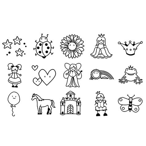 15 unterschiedliche Motive, 1 rotes und 1 schwarzes Stempelkissen.