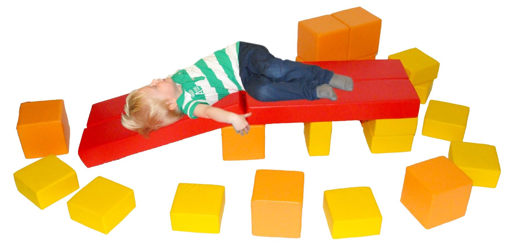 Zwei in einer! Bewegungsmatten mit Bausteinen für den U3-Bereich sind die perfekte Kombination für jeden Kindergarten und alle U3-Gruppen. Im Inneren der Matten befinden sich verschiedene Softquader- und Softrechtecksteine, die die Matte wunderbar weich auspolstern. Wenn auf den Matten nicht geturnt, gekrabbelt oder gelegen wird, dann kann man den Reißverschluss öffnen, die farbenfrohen Bausteine entnehmen und damit PEKIP-Bewegungsspiele durchführen oder Ballbäder, Hindernisparcours, Rutschen, Türme und vieles mehr konstruieren. Diese vielseitigen Kombimatten fördern die Motorik, Koordination und Geschicklichkeit und beflügeln die Fantasie und Kreativität. Durch die Kunstlederhüllen sind Bausteine wie auch die Matten einfach zu reinigen.