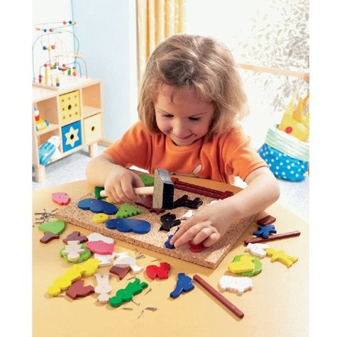 Inhalt: Korkplatte, Nägel, Holzhammer, 30 Holzspielsteine, bunt sortiert.