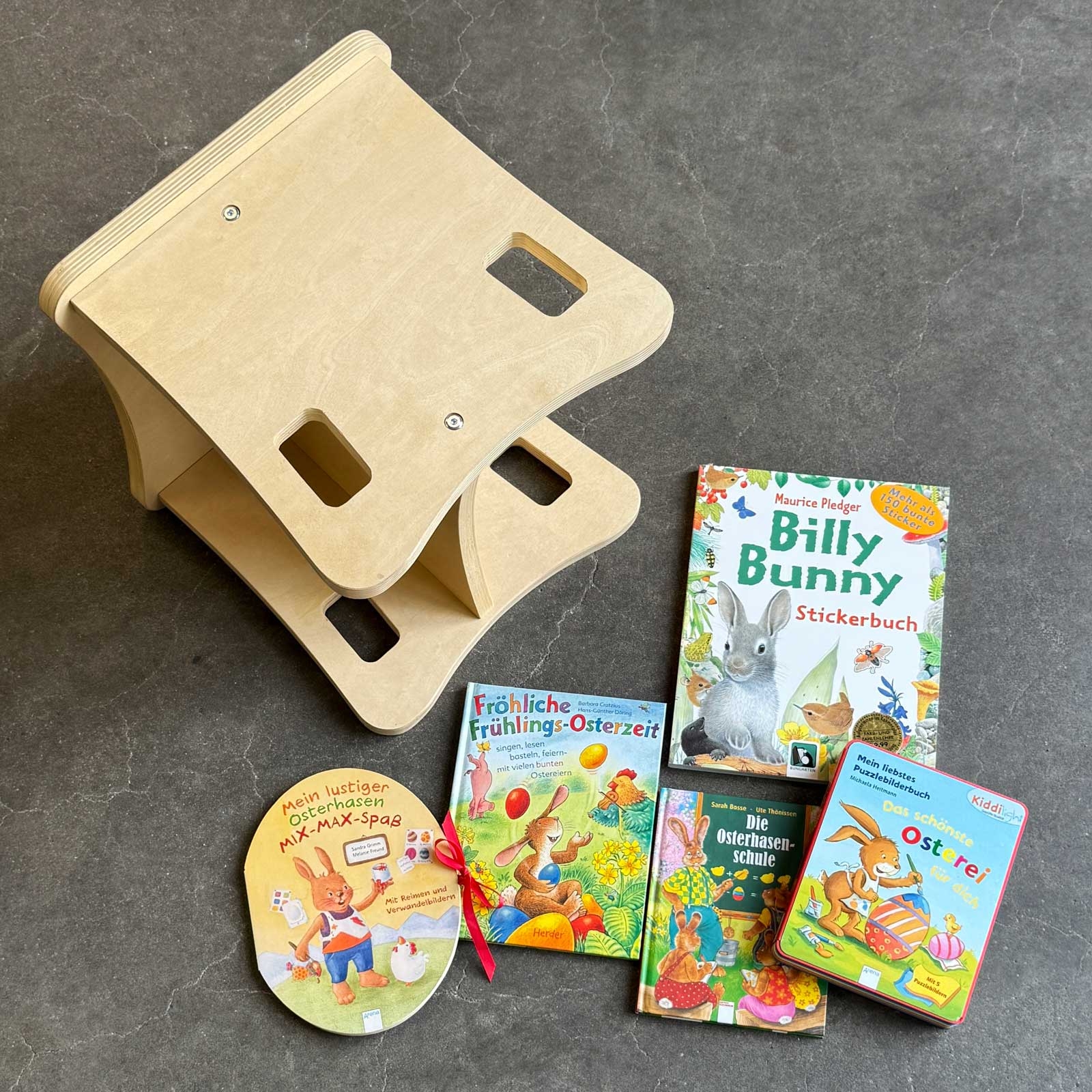 Der robuste Wendehocker unterstützt die Selbstständigkeit der Kinder, während die Osterbücher spielerisch Wissen und Kreativität fördern. Die Kiste sorgt für Ordnung im Gruppenraum oder der Leseecke.
