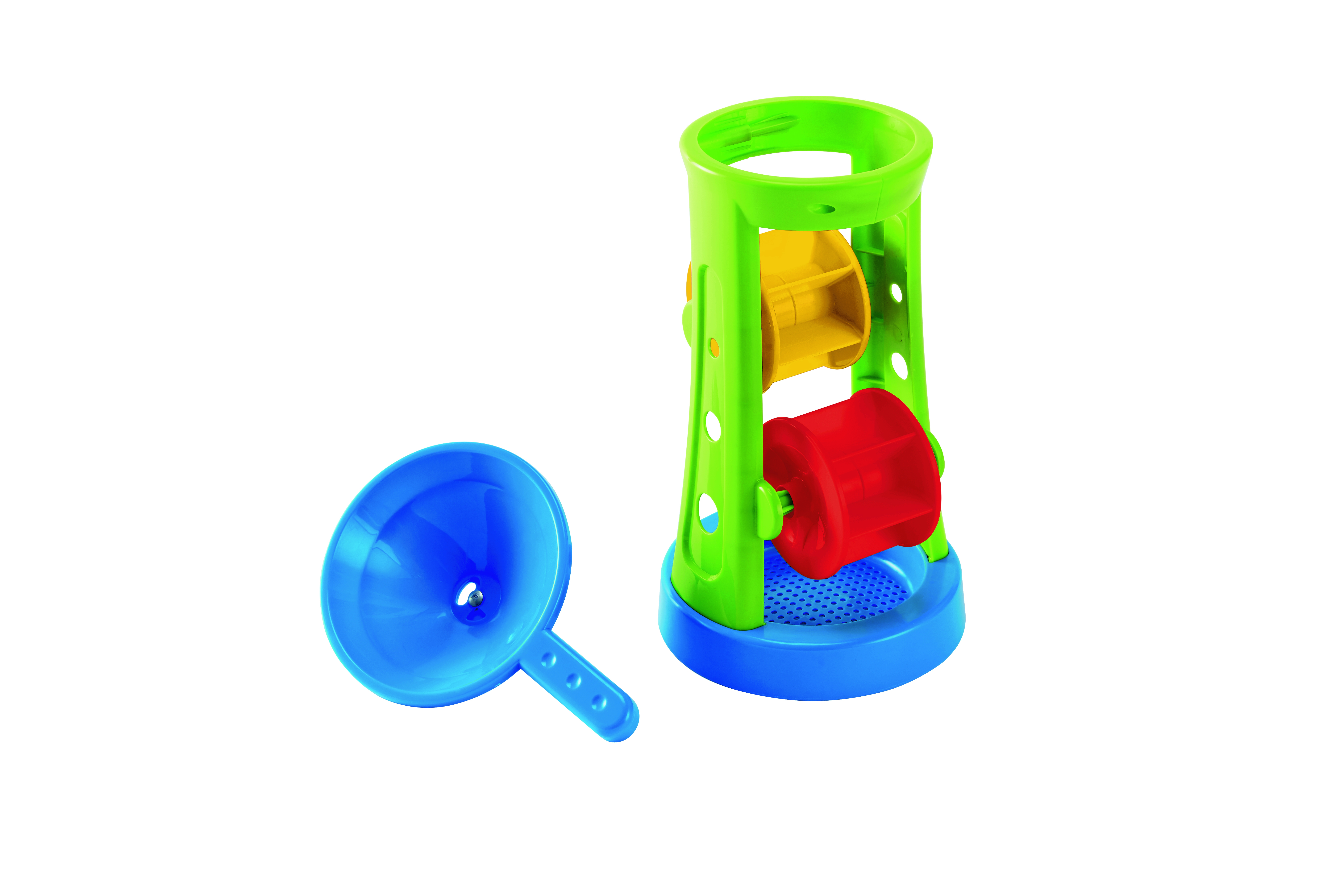 Wasser marsch - und zwar durch die Sand- und Wassermühle. Die Räder der farbenfrohen Mühle aus Kunststoff drehen sich, sobald man Wasser oder Sand in den abnehmbaren Trichter füllt. Sie lädt Kinder ab 18 Monate zum Spielen und Experimentieren ein und sorgt für Spaß am Strand oder im Sandkasten. Der Trichter ist abnehmbar und dient auch als Schöpfkelle.
