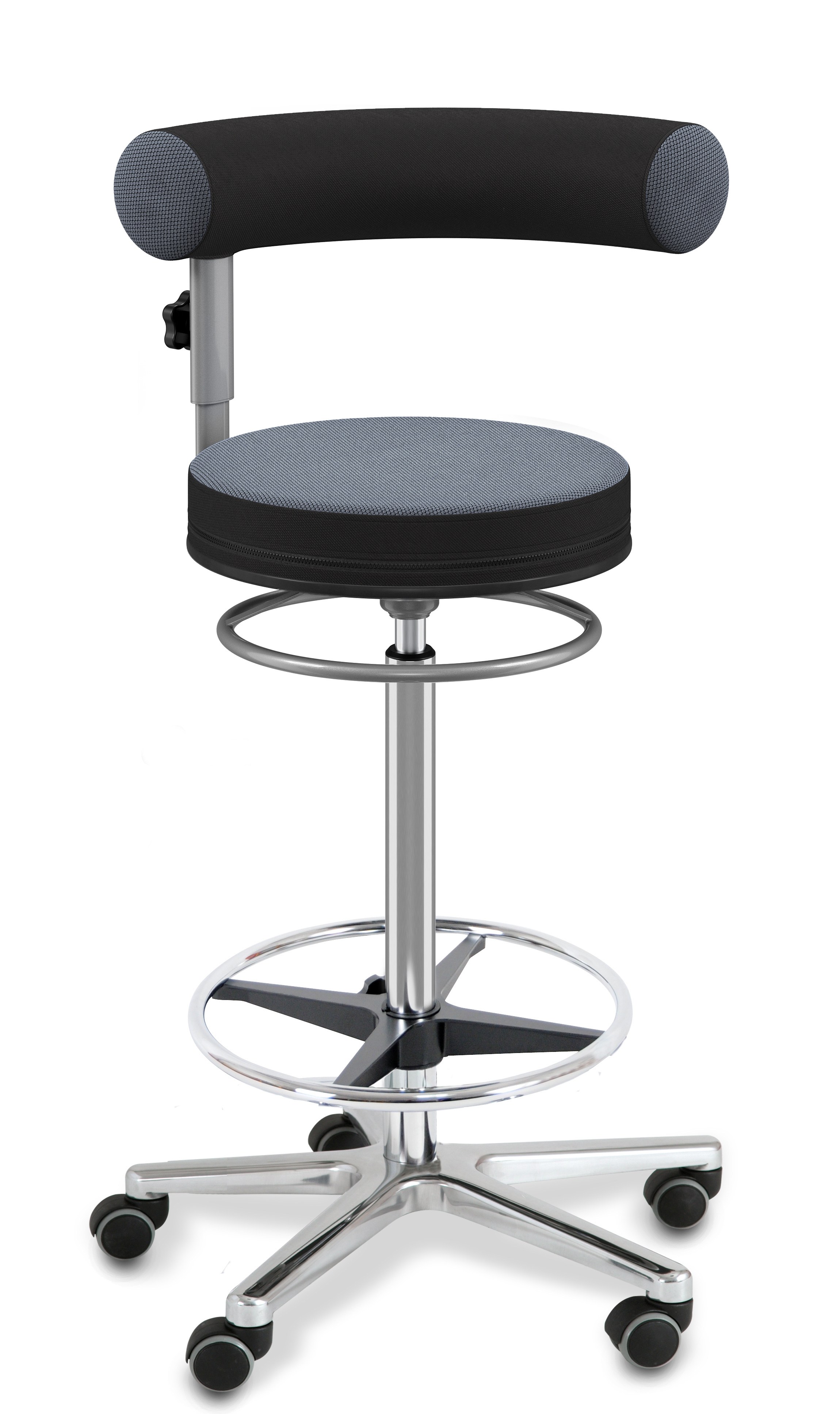 - Vollständig schwenkbare, gepolsterte Rückenlehne (360°), flexibel positionierbar: seitlich, vorn zum Abstützen der Arme oder klassisch nach hinten zur Rückenunterstützung