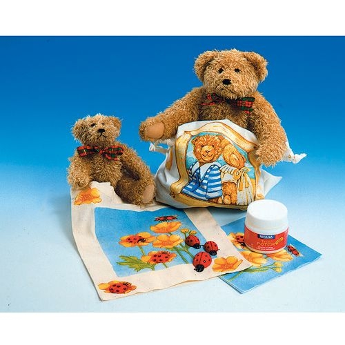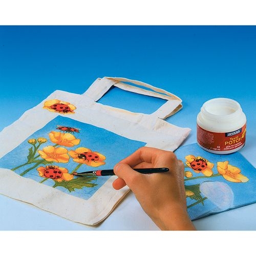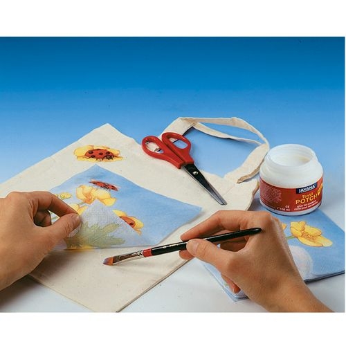 Textil-POTCH auf die Stofffläche auftragen, Motiv auflegen. Mit Pinsel die Falten herausstreichen.