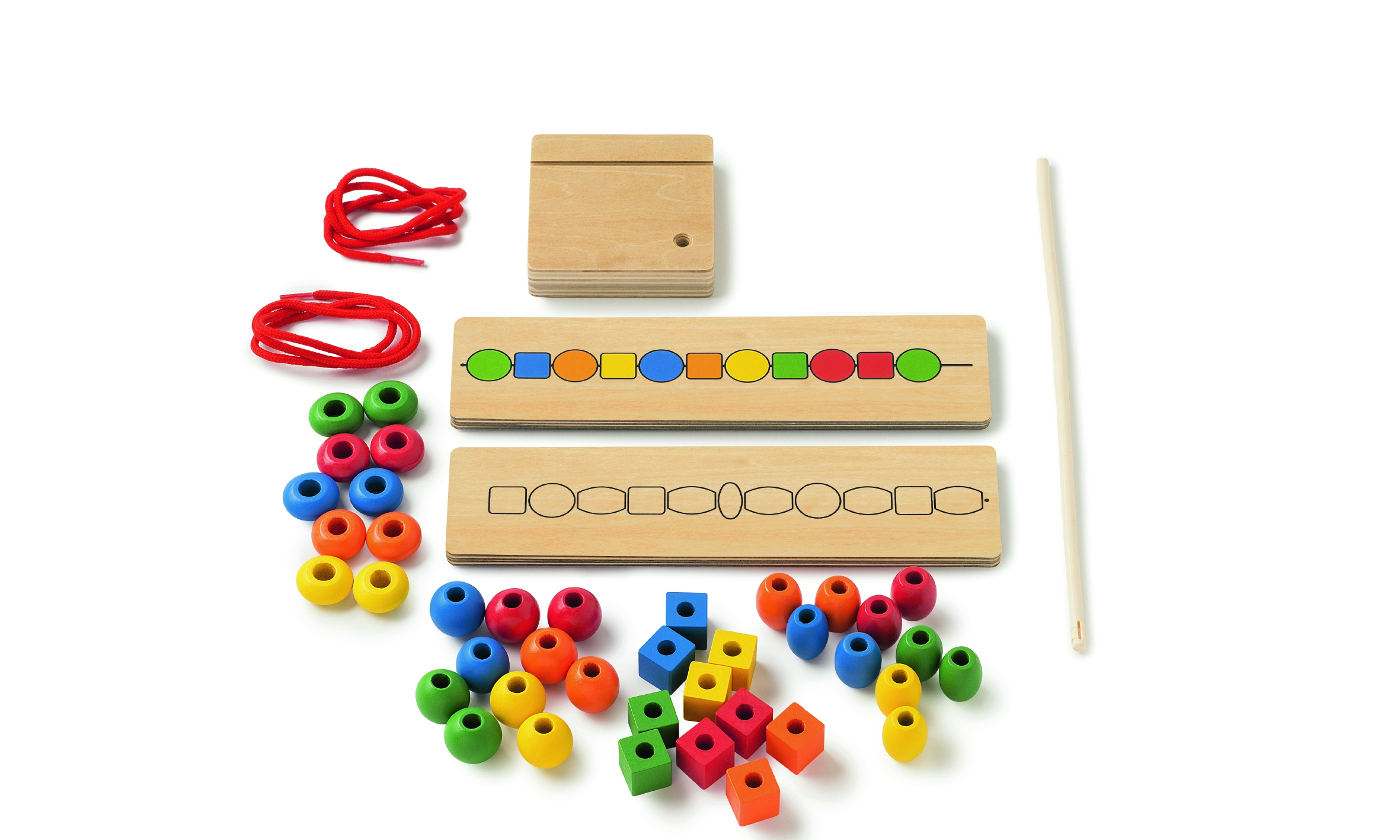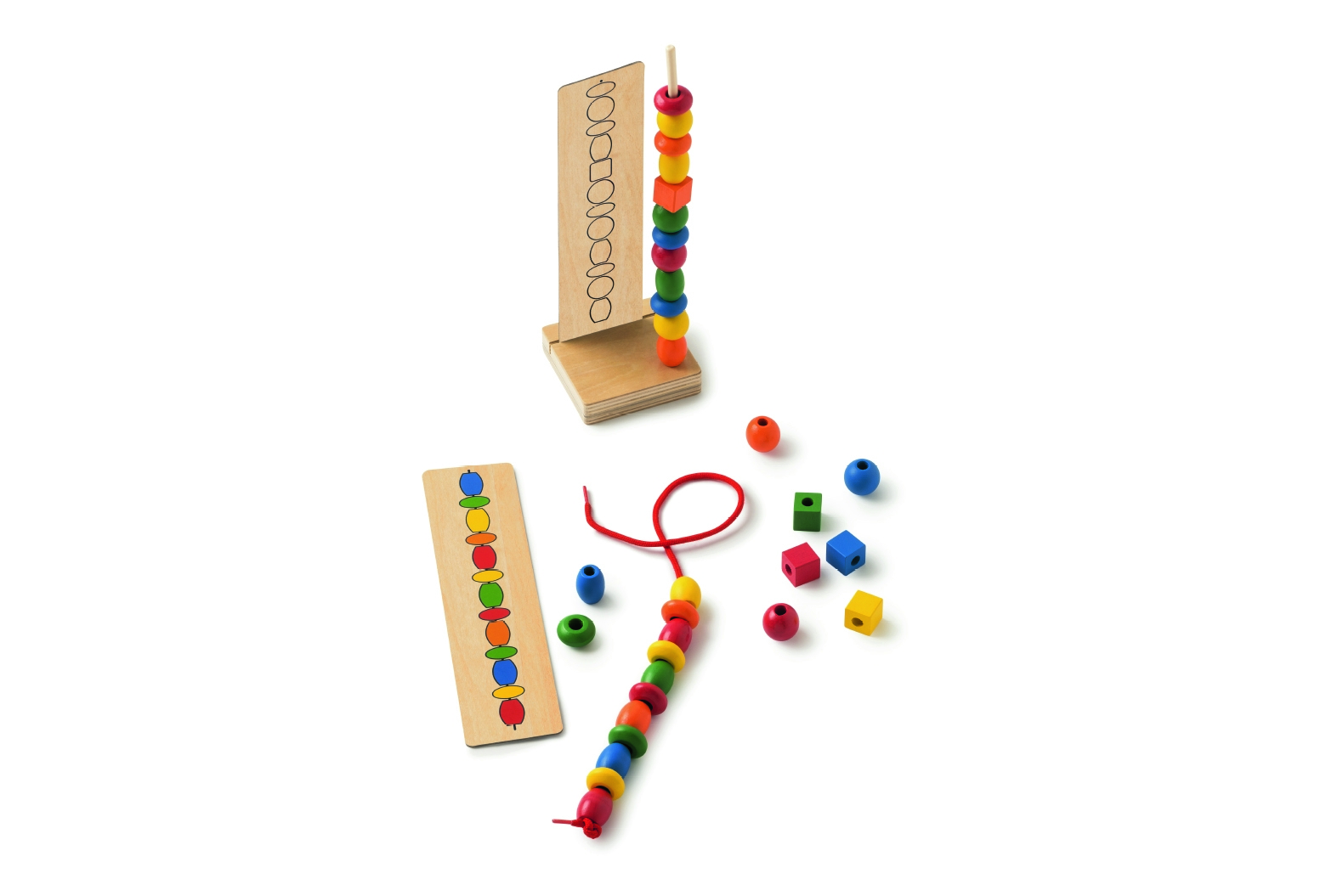 Farben, Formen, Reihenfolge und Muster kennenlernen: Die Muster der Aufgabenkarten auf Ständer oder Schnur nachmachen. Bei den schwarzweißen Aufgabenkarten können die Farben selbst gewählt werden.