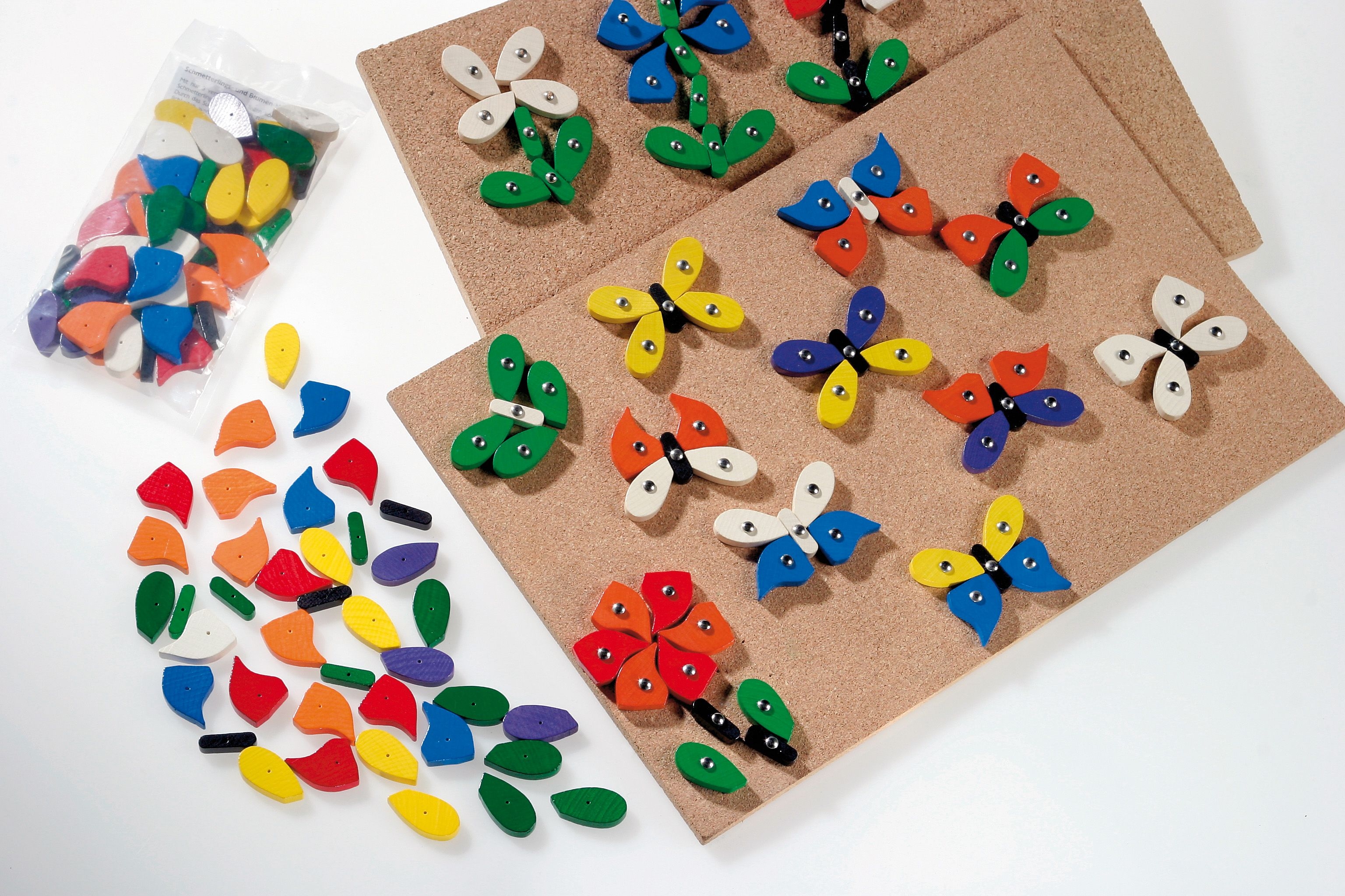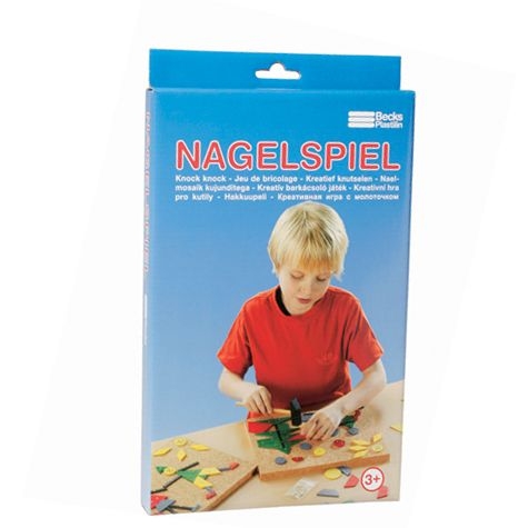 Nagelspiel Inhalt: Korkplatte, Nägel, Holzhammer, 30 Holzspielsteine, bunt sortiert.