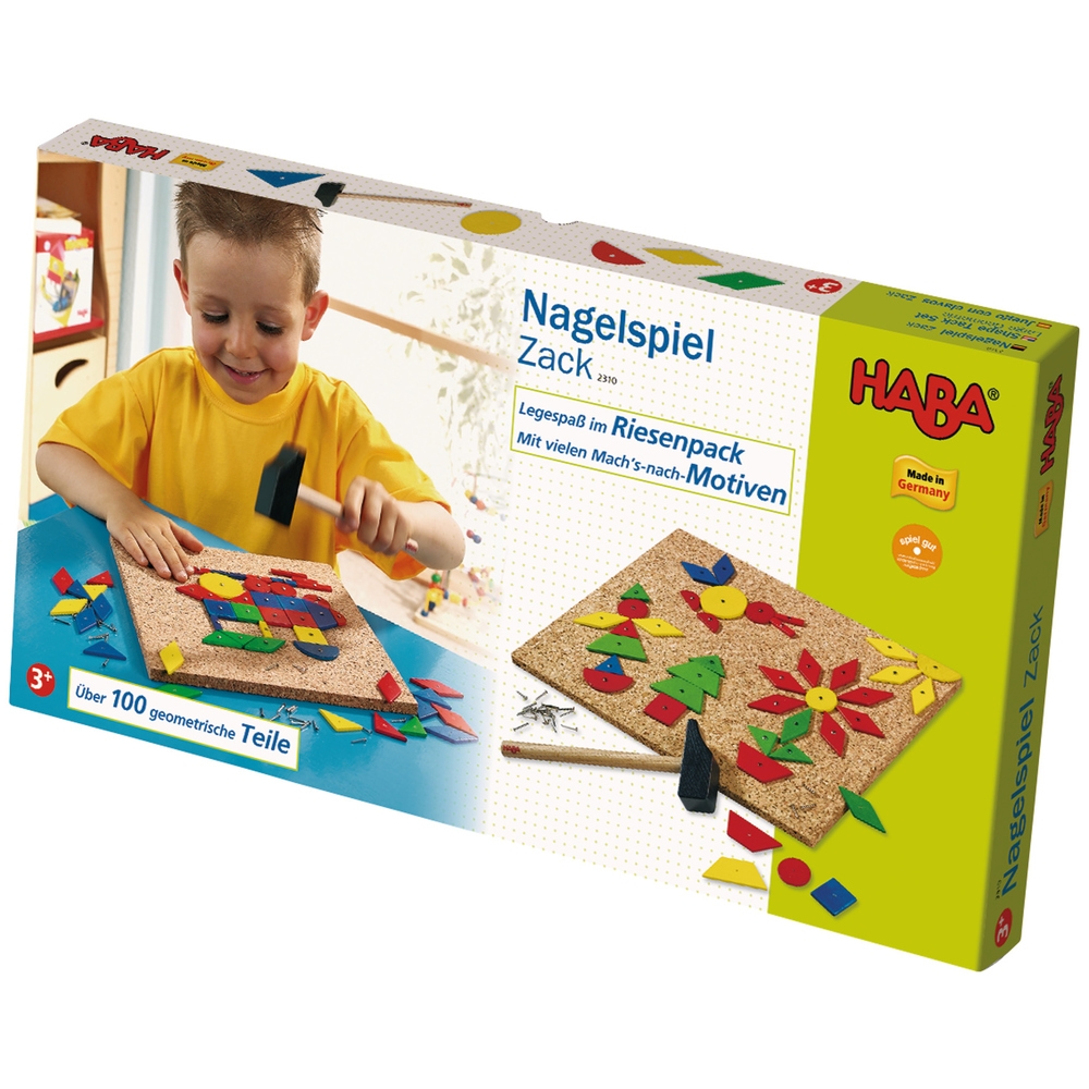 HABA Nagelspiel Zack Das HABA-Nagelspiel-Zack bietet Lege- und Nagelspaß im Riesenpack und fordert die kindliche Kreativität heraus: 100 bunte Holztäfelchen in verschiedenen geometrischen Grundformen mit vielen Mach's-nach-Motiven inspirieren schon die Kleinsten immer wieder zu neuen Ideen. Die 26,3 x 43,1 cm große Grundplatte aus Kork bietet dafür viel Platz. Farbenfrohe Pflanzen, Tiere oder Gegenstände wie Autos oder Schiffe lassen sich kinderleicht umsetzen. Genauso viel Spaß macht das freie Gestalten von Fantasieformen und bunten Mustern. Dabei trainieren die Kinder spielerisch ihre Auge-Hand-Koordination und ihre Feinmotorik. Das Nagelspiel Zack ist ein schönes Geschenk für kleine Nagelbildhauer ab 3 Jahren. Inhalt: 100 Holztäfelchen (3 mm stark). Warnhinweise: Achtung. Nicht für Kinder unter 3 Jahren geeignet. Kleine Teile. Erstickungsgefahr.