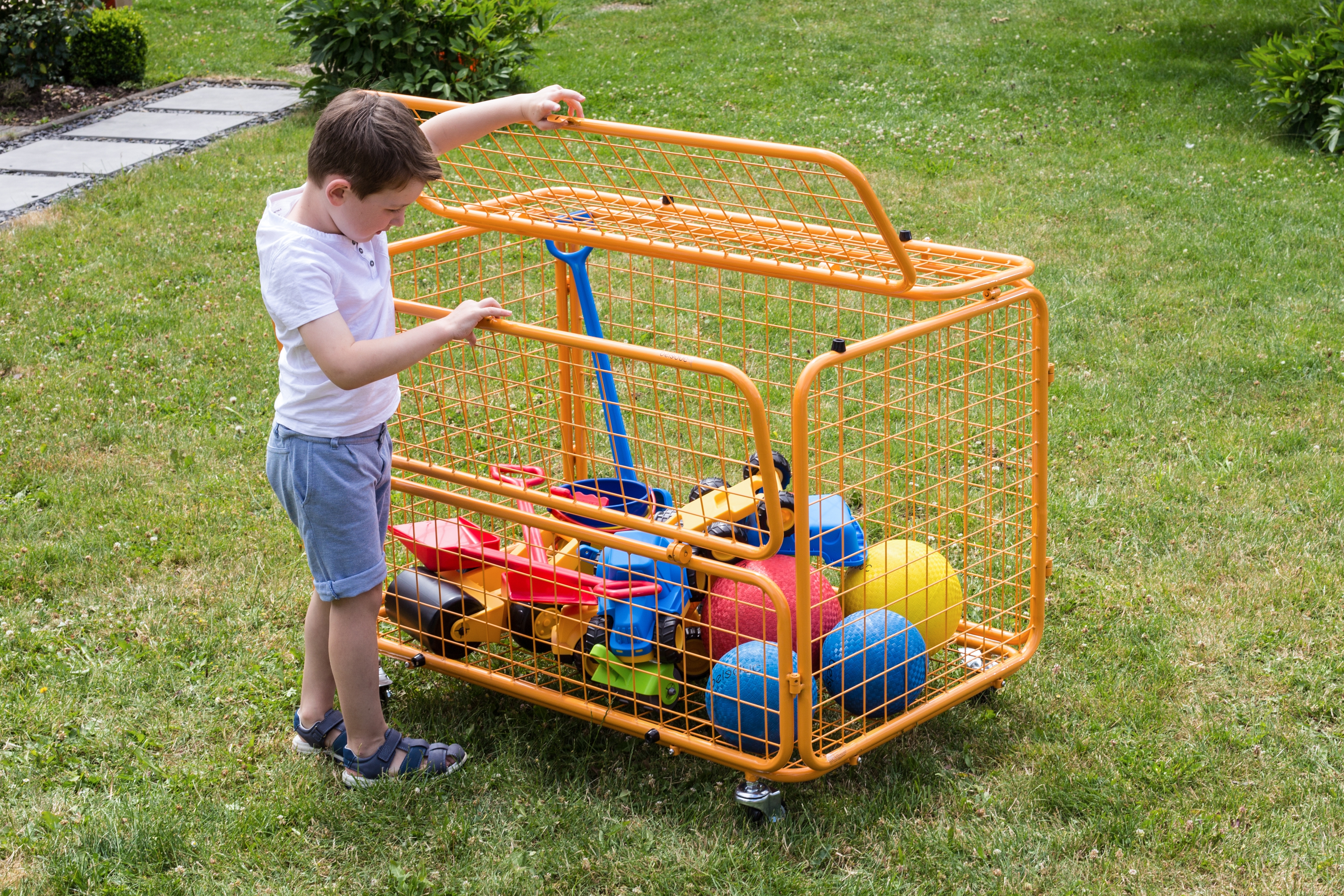 Der stabile Transportwagen eignet sich prima zum Verstauen von Sandspielzeug, Bällen und weiteren Utensilien, zur Sicherheit kann ein Schloss angebracht werden. Um den Inhalt freizugeben kann der Transportwagen von oben als auch vorne geöffnet werden und ermöglicht so bereits den kleinsten eine eigenständige Nutzung. Mit seinen vier feststellbaren Lenkrollen ist die Positionsveränderung sowohl in Turnhallen als auch im Freigelände möglich.